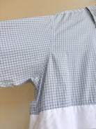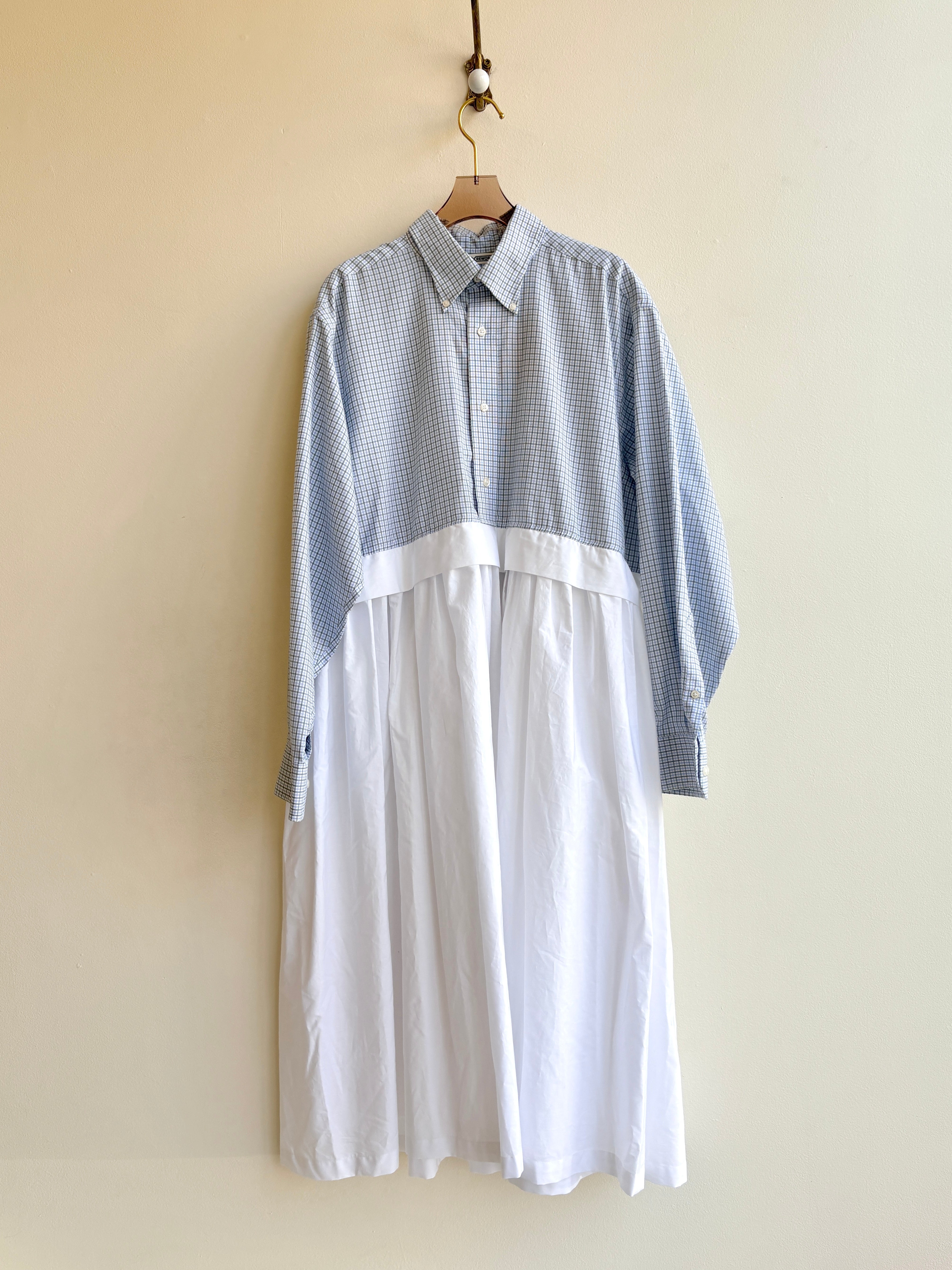 For the newest dress style for our Made X Reworked line, we’re sourcing men’s shirts from a local social-justice thrift store, Thrift2Fight, and breathing new life into them. Each design is slightly different and of course starts with a different shirt. This one combines a blue men’s button-down in a windowpane plaid with white cotton shirting for a full-skirted shirtwaist shirtdress with an empire waistline.