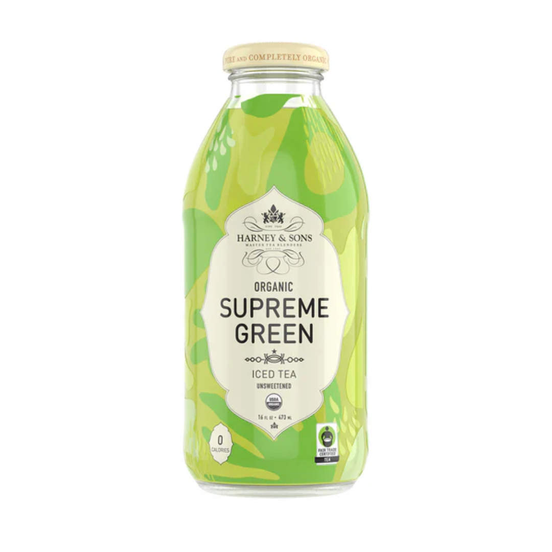 - Brewed with 4 decades of tea-making experience, this Harney & Sons organic supreme green unsweetened iced tea delivers the taste of quality in every sip! Made with a classic selection of delicate, grassy green tea leaves and left unsweetened for unadulterated taste, this pre-brewed iced tea is a deliciously refreshing pick-me-up with a kick of caffeine.