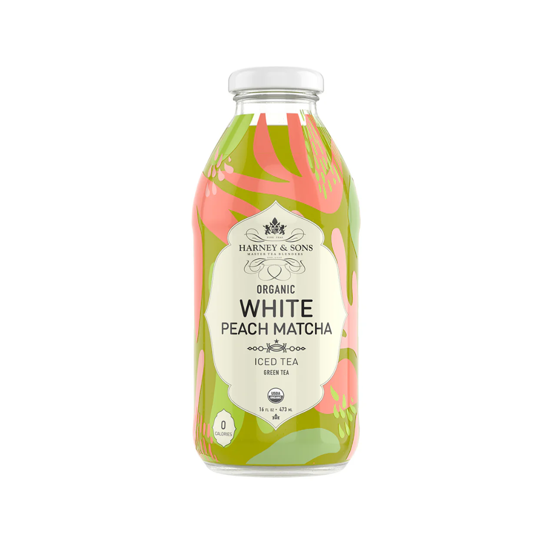 - Brewed with 4 decades of tea-making experience, this Harney & Sons organic white peach matcha iced tea delivers the taste of quality in every sip! Made with a blend of matcha and Japanese Bancha tea leaves flavored with natural peach, this pre-brewed iced tea is a deliciously refreshing pick-me-up with a kick of caffeine. It has a summery, ripe peach flavor and a delightful fruit fragrance that will tempt customers back for more