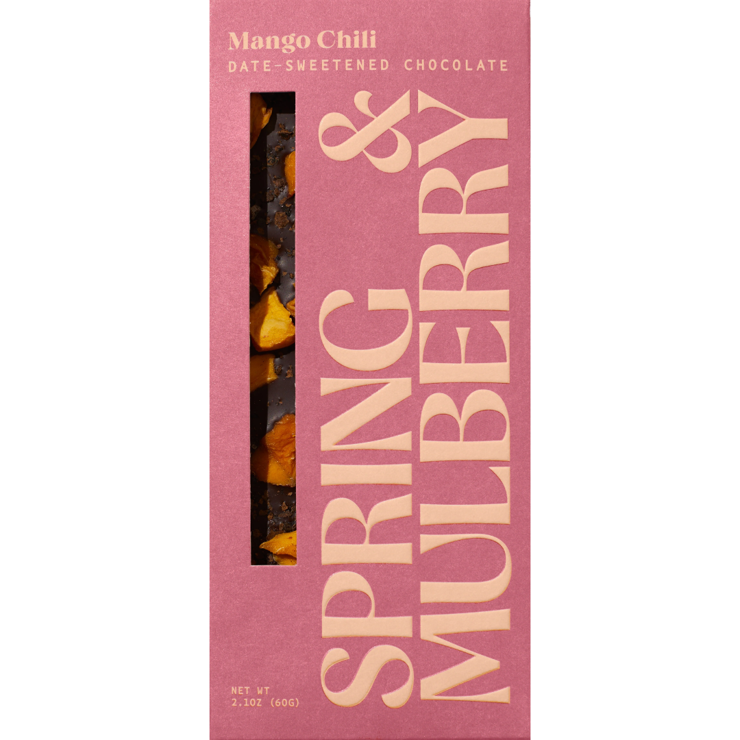 • Succulent mango slices mingle with subtly smoky chili, tart black lime, and a pinch of flake salt on a bed of date-sweetened dark chocolate, setting off a savory sweetness that feels both tantalizing and enchanting. No added sugar. Direct-trade cacao.