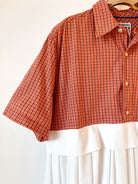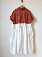 For the newest dress style for our Made X Reworked line, we’re sourcing men’s shirts from a local social-justice thrift store, Thrift2Fight, and breathing new life into them. Each design is slightly different and of course starts with a different shirt. This one combines a pumpkin, black, and white plaid short sleeve shirt combined with cotton shirting for a full-skirted shirtwaist shirtdress with an empire waistline.
