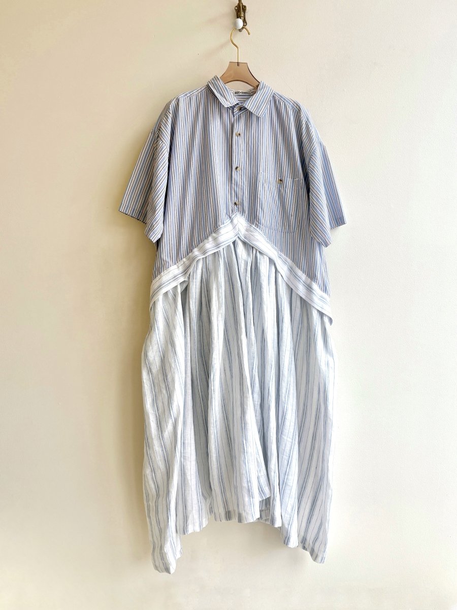For the newest dress style for our Made X Reworked line, we’re sourcing men’s shirts from a local social-justice thrift store, Thrift2Fight, and breathing new life into them. Each design is slightly different and starts with the shirt. This one combines a men’s button-down short sleeve shirt in powder blue, with a ocher yellow and white vertical stripe, and a white striped skirt, in baby blue and custard yellow, for a full-skirted shirtdress with a sharp inverted V waistline.