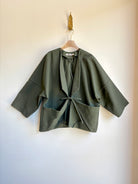 With its easy fit, distinctive origami pockets, folded lapel and front ties, our unisex Chore Jacket is a versatile statement piece that can be worn as outerwear or as you would a blazer or cardigan. This army green cotton canvas version is about as versatile as a jacket can be — dress it up or down as you please. Featured in Tried and True (outfit of the day).