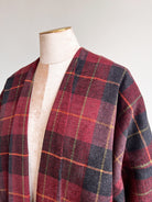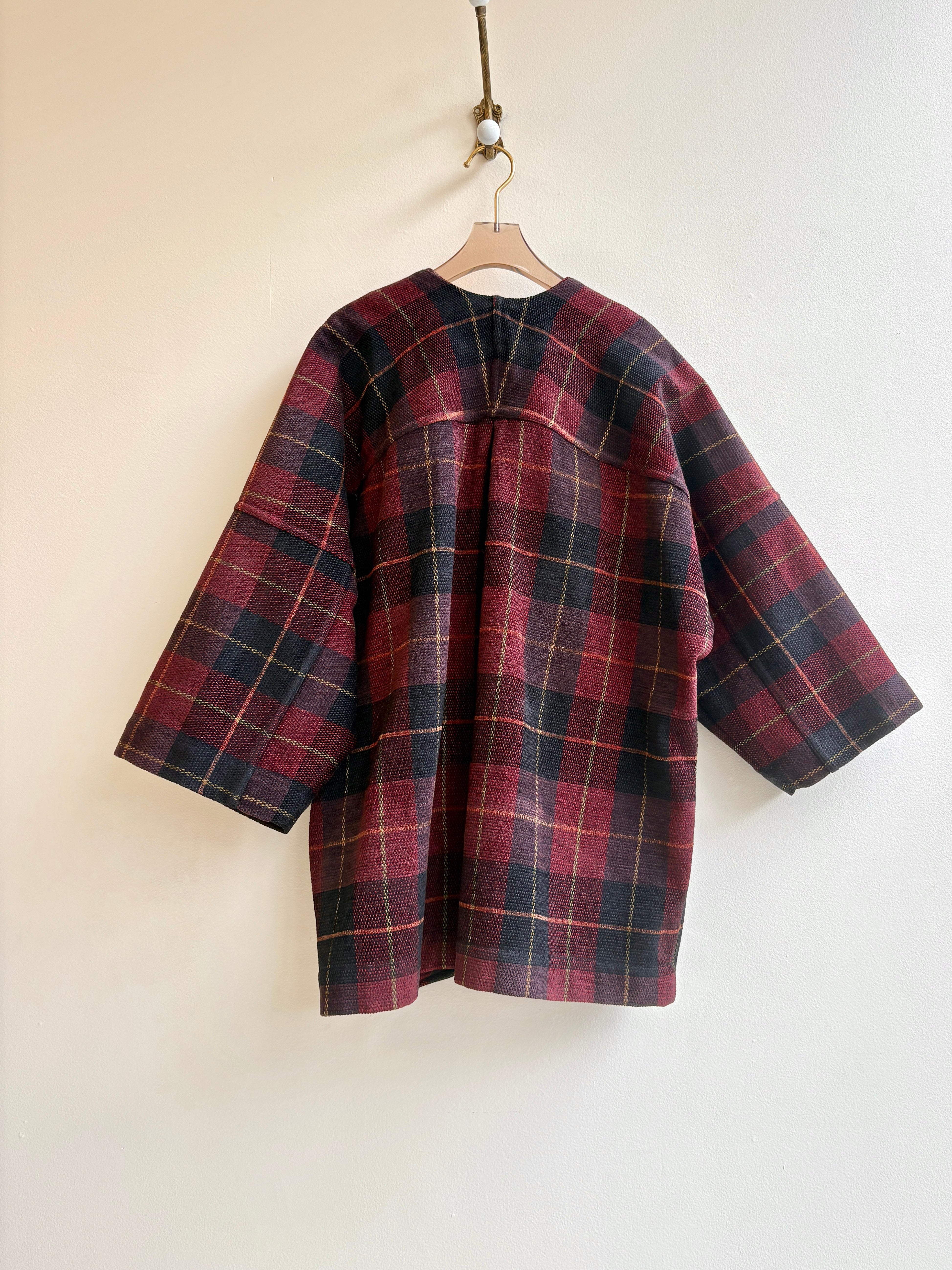With its easy fit, distinctive origami pockets, folded lapel and front ties, our unisex Chore Jacket is a versatile statement piece that can be worn as outerwear or as you would a blazer or cardigan. This one is one-of-a-kind, sewn from a substantial burgundy-red plaid deadstock textile that’s perfect for fall and into the holiday season.