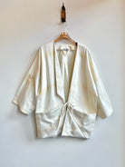 With its easy fit, distinctive origami pockets, folded lapel and front ties, our unisex Chore Jacket is a versatile statement piece that can be worn as outerwear or as you would a blazer or cardigan. This sun dyed version has warm ocher accents over a warm white base.