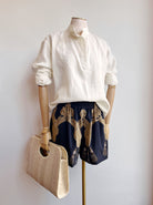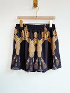 Our unisex MXH Town Shorts are the quintessential easygoing garment, designed and sewn right here in our Catskill atelier. The triple-channel elastic waistband looks polished and lies flat, while being as comfortable as pajamas. And the side-seam pockets keep the silhouette clean, so you can dress them up or down, wear them in the city, on the beach, or anywhere in between. This pair was sewn from a stunning deadstock silk fabric with a ropes-and-tassels print in neutral tones on black.