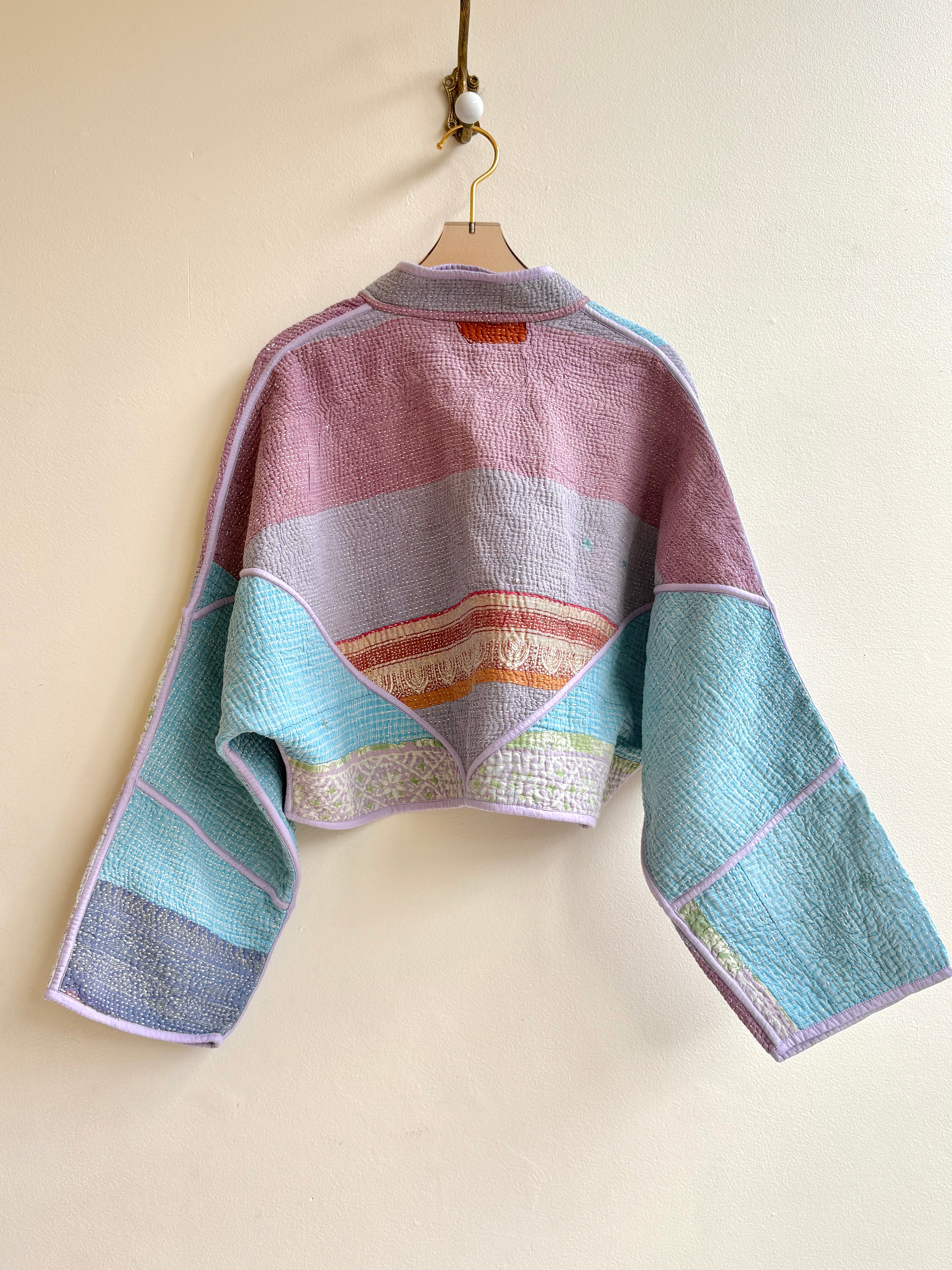 The Kaira Cropped Jacket is made from repurposed Vintage Kantha quilts, and the original patina includes areas of fraying, patches and an age-softened feel.