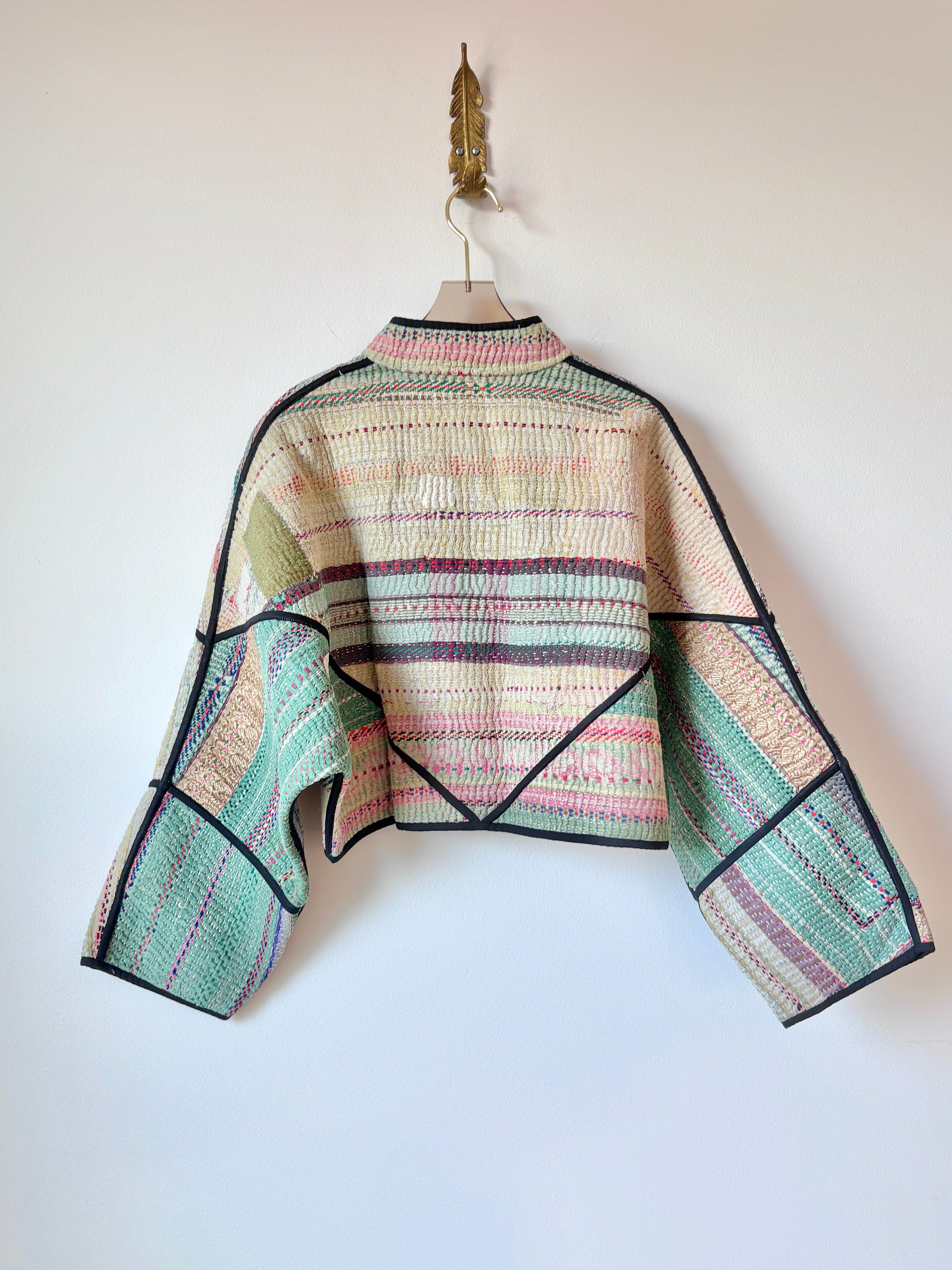 The Kaira Cropped Jacket is made from repurposed Vintage Kantha quilts, and the original patina includes areas of fraying, patches and an age-softened feel.