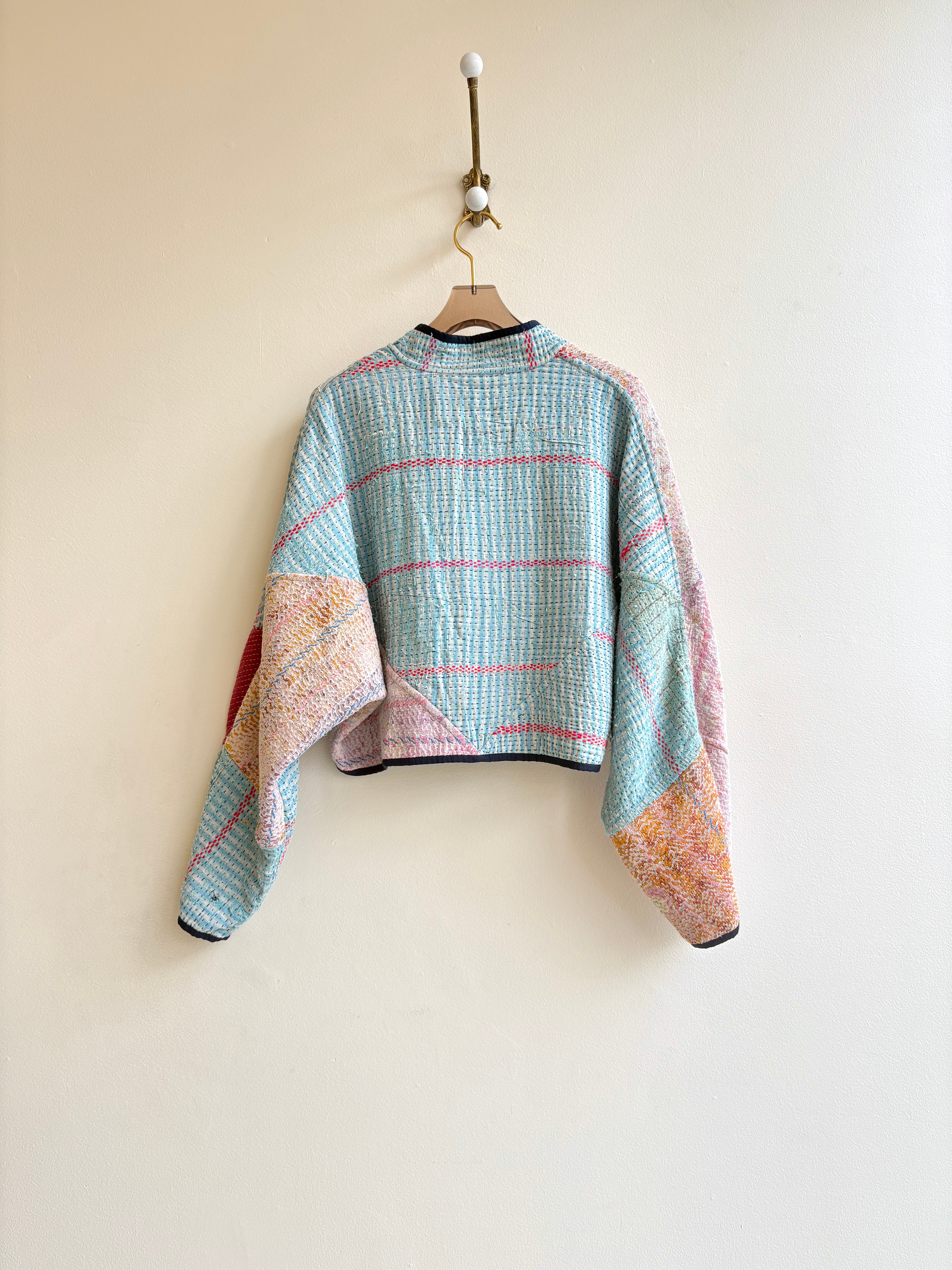 The Kaira Cropped Jacket is made from repurposed Vintage Kantha quilts, and the original patina includes areas of fraying, patches and an age-softened feel.
