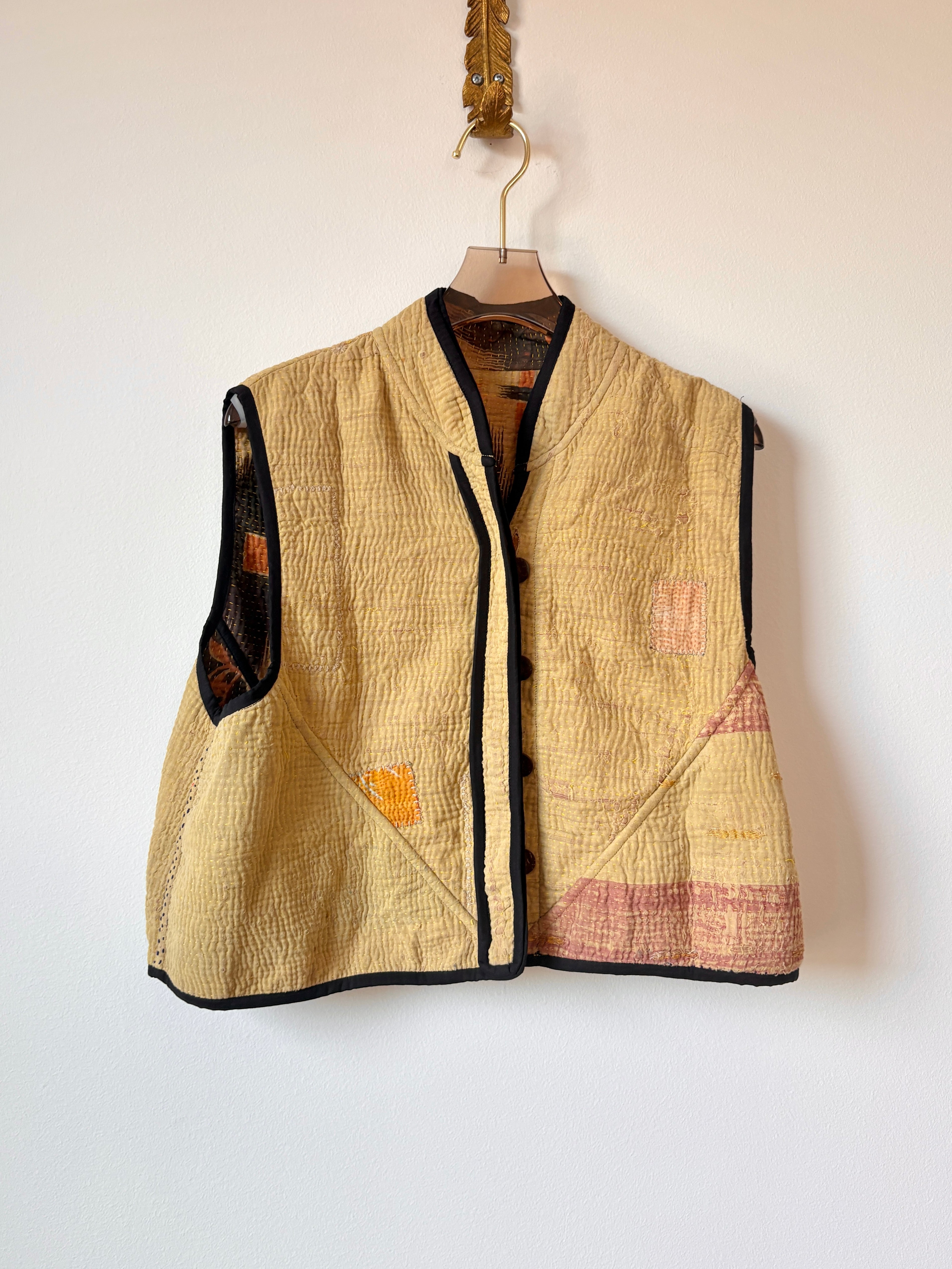 The Kaira Cropped Vest is made from repurposed Vintage Kantha quilts, and the original patina includes areas of fraying, patches and an age-softened feel.
