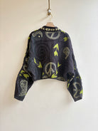 The Kaira Suzani Cropped Jacket is made from repurposed Vintage Kantha quilts, and the original patina includes areas of fraying, patches and an age-softened feel.