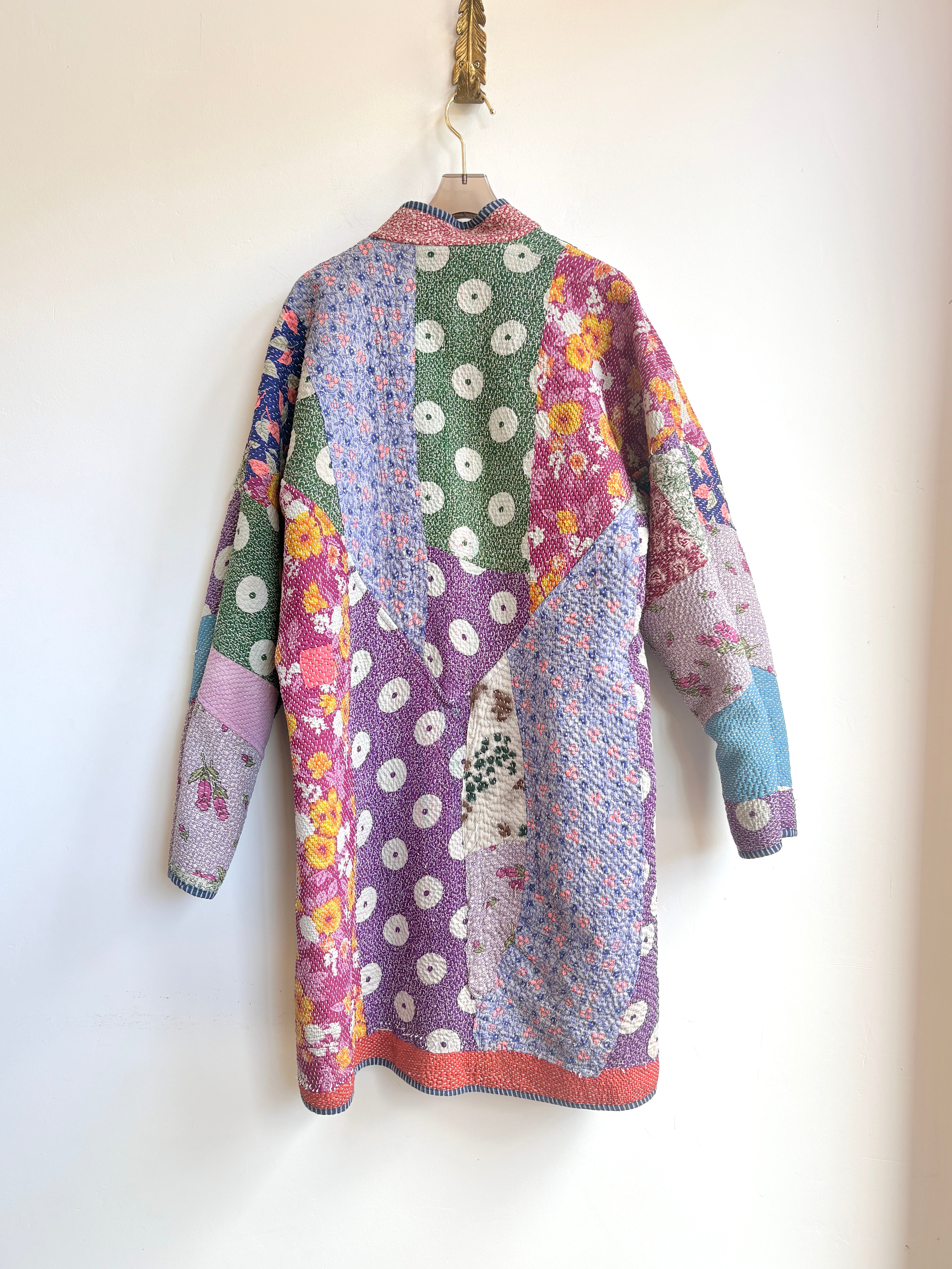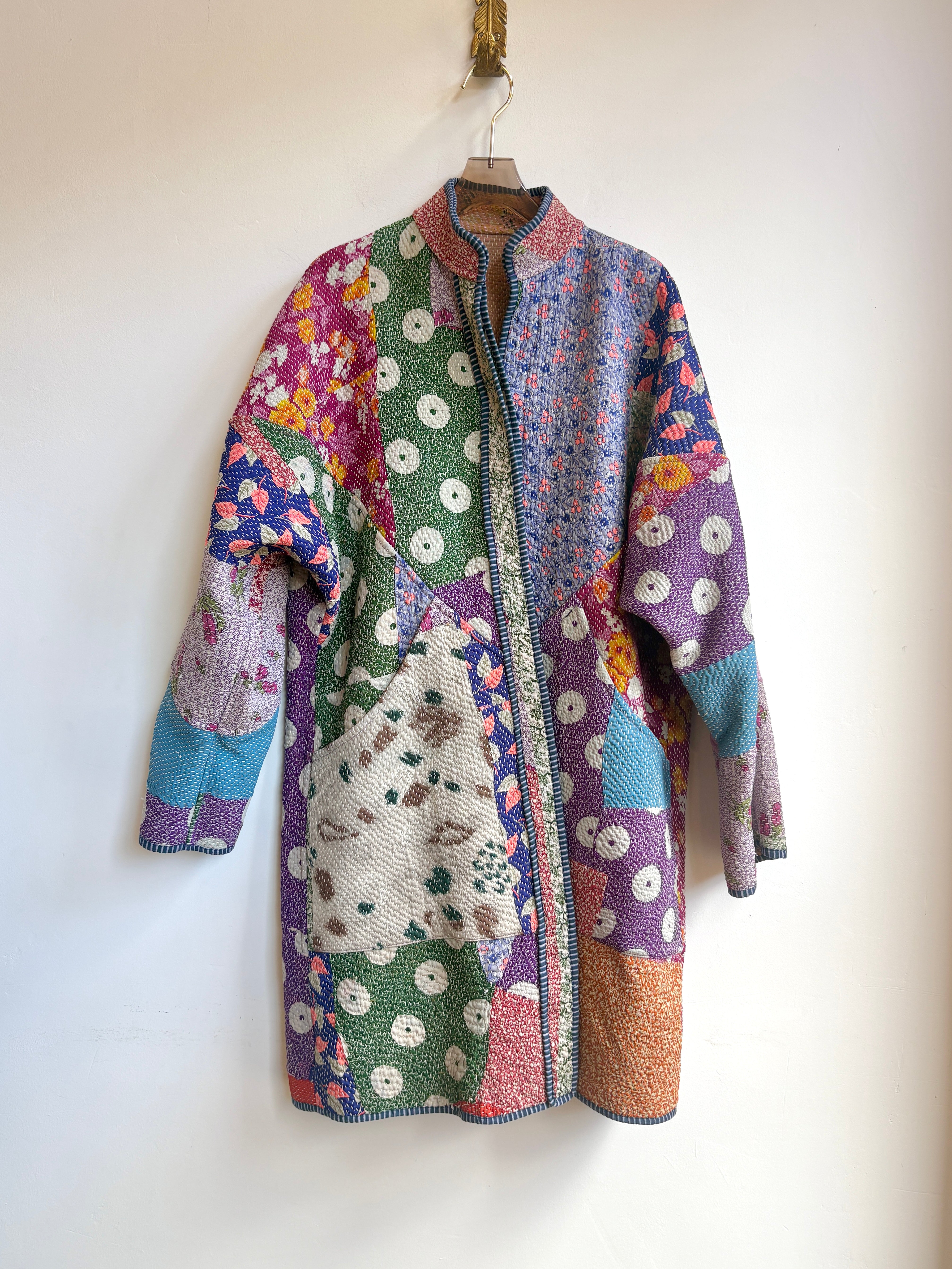 This Long Trench Jacket is made from repurposed Vintage Kantha quilts, and the original patina includes areas of fraying, patches and an age-softened feel.