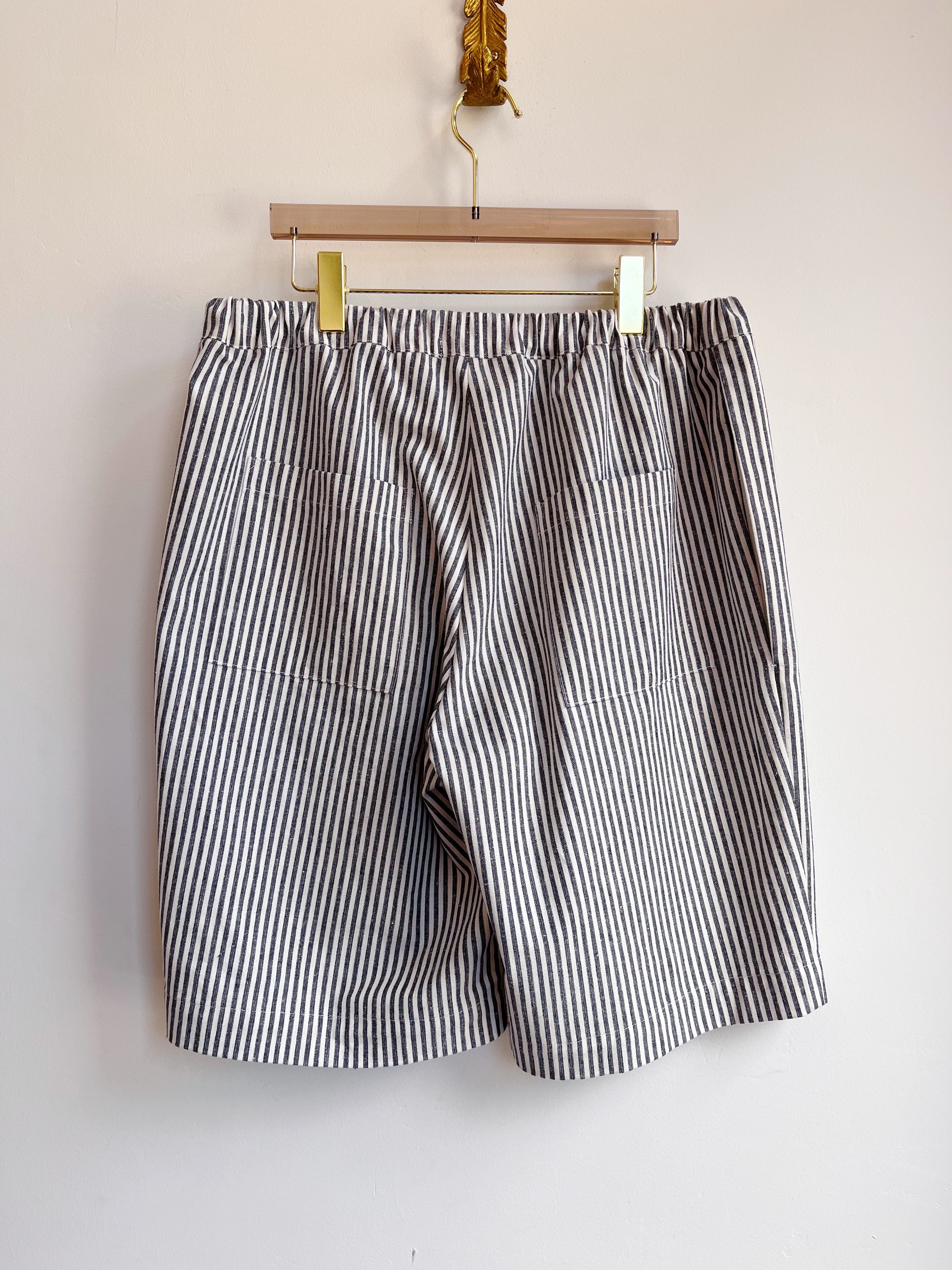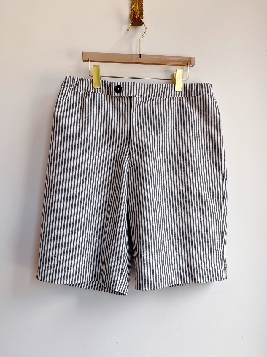 Our new unisex Bermuda shorts are Grandpa chic in the best way, and with a partial elastic waist and flat fly front, they’re incredibly comfortable as well. The button tab is the perfect vintage-style detail, and we’ve made this pair from a beautiful black and white striped cotton. They look great on every body we’ve tried them on!
