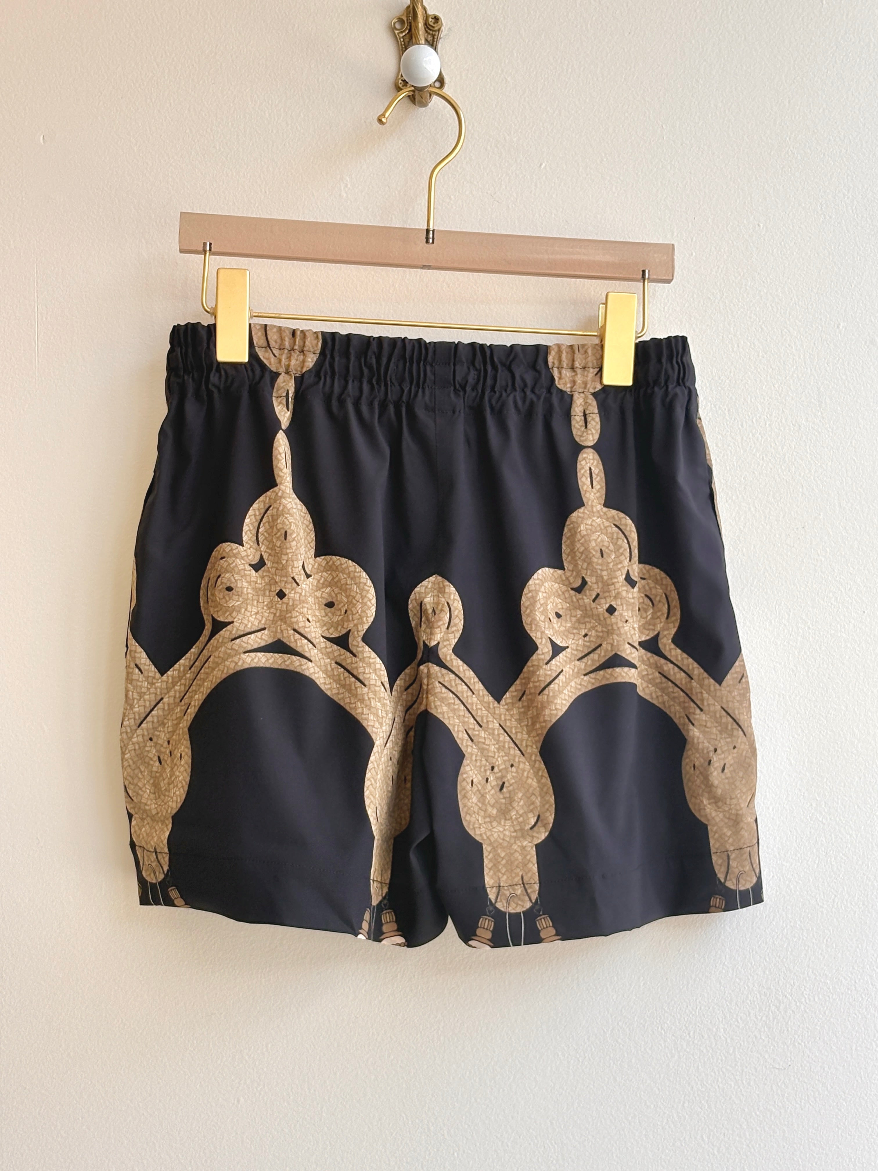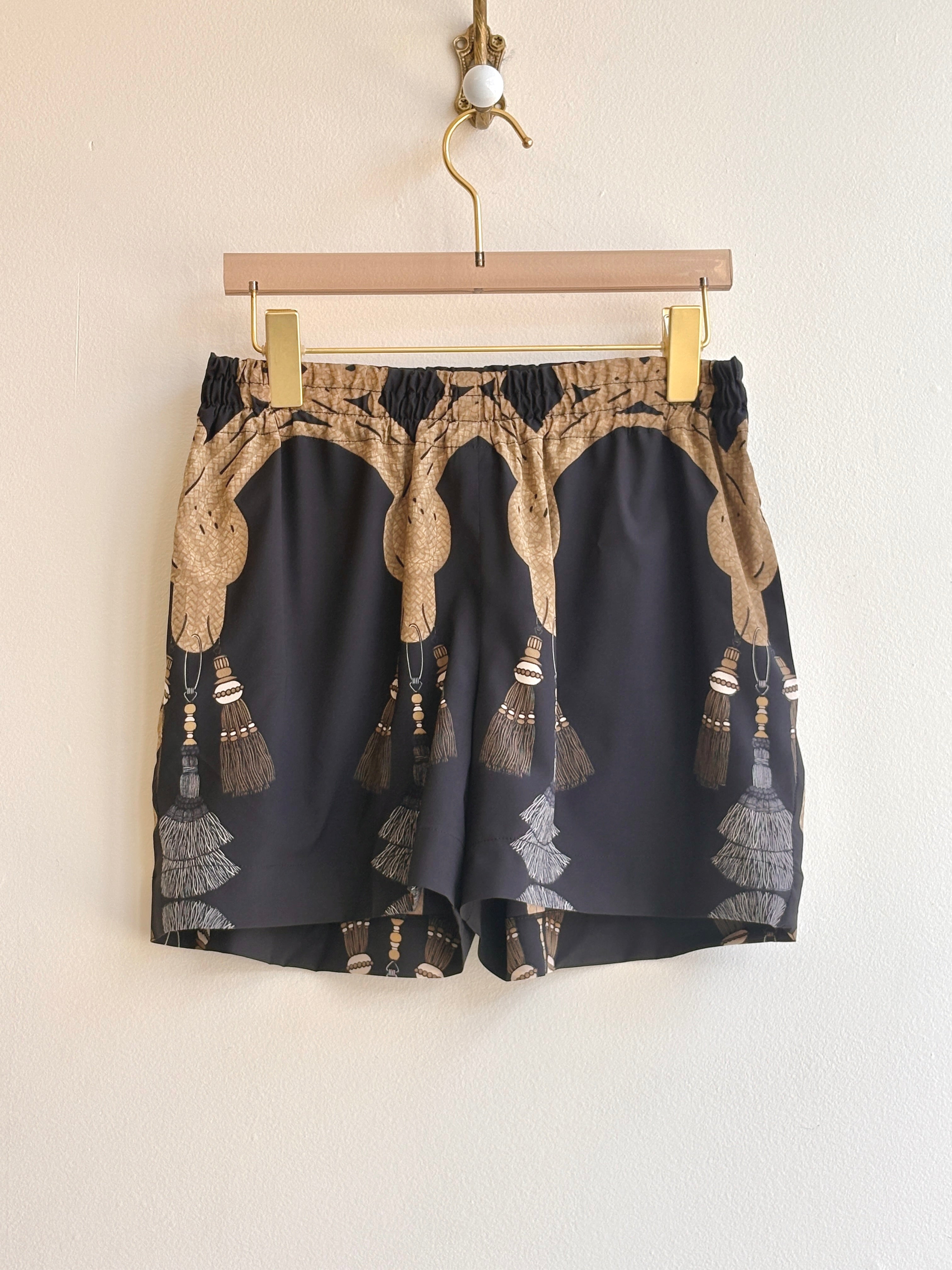 Our unisex MXH Town Shorts are the quintessential easygoing garment, designed and sewn right here in our Catskill atelier. The triple-channel elastic waistband looks polished and lies flat, while being as comfortable as pajamas. And the side-seam pockets keep the silhouette clean, so you can dress them up or down, wear them in the city, on the beach, or anywhere in between. This pair was sewn from a stunning deadstock silk fabric with a ropes-and-tassels print in neutral tones on black.