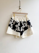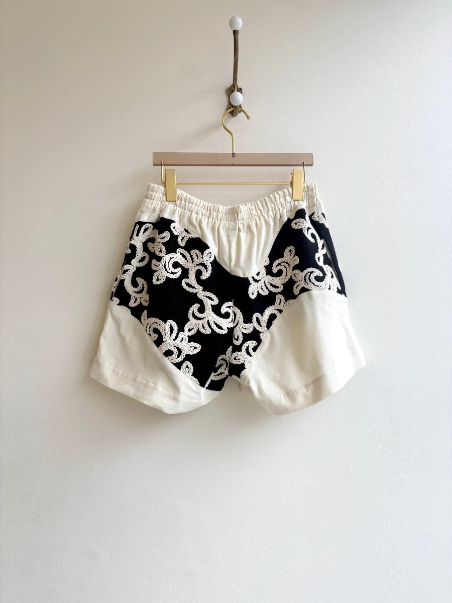- Deadstock black and white couching-stitch embroidered fabric for the main section, exact fiber content unknown, feels like a wool blend