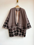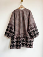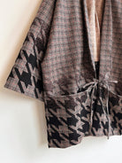 With its easy fit, folded lapel, front ties and square front pockets, our unisex Chore Jacket is a versatile statement piece that can be worn as outerwear or as you would a blazer or cardigan. This one is sewn from a light weight red, black and grey plaid deadstock textile with a large scale houndstooth pattern on the bottom edge that fades into the print. This jacket is a perfect addition for fall and into the holiday season.