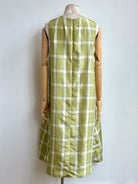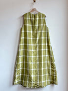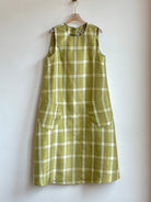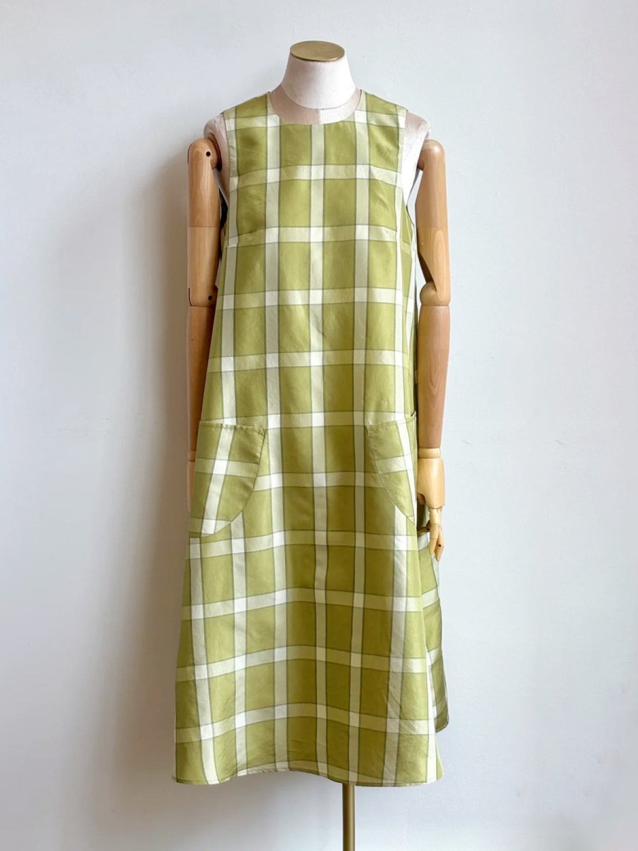 On its own or under a sweater or jacket, dressed up or down, our Chore Dress is a favorite for its ease and versatility. This one is sleeveless with patch pockets and was sewn on site from an amazing vintage plaid taffeta.