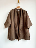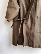 One of our newest styles, this unisex haori-style jacket was inspired by a vintage piece we fell in love with and wanted to keep alive. It’s sewn from our favorite hemp-cotton canvas in moss greenish-brown, with self ties and magenta embroidery accent stitching at the sides and sleeve seams. It looks amazing with the matching Bermuda shorts, on its own with jeans or trousers, tied or left open.