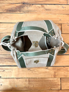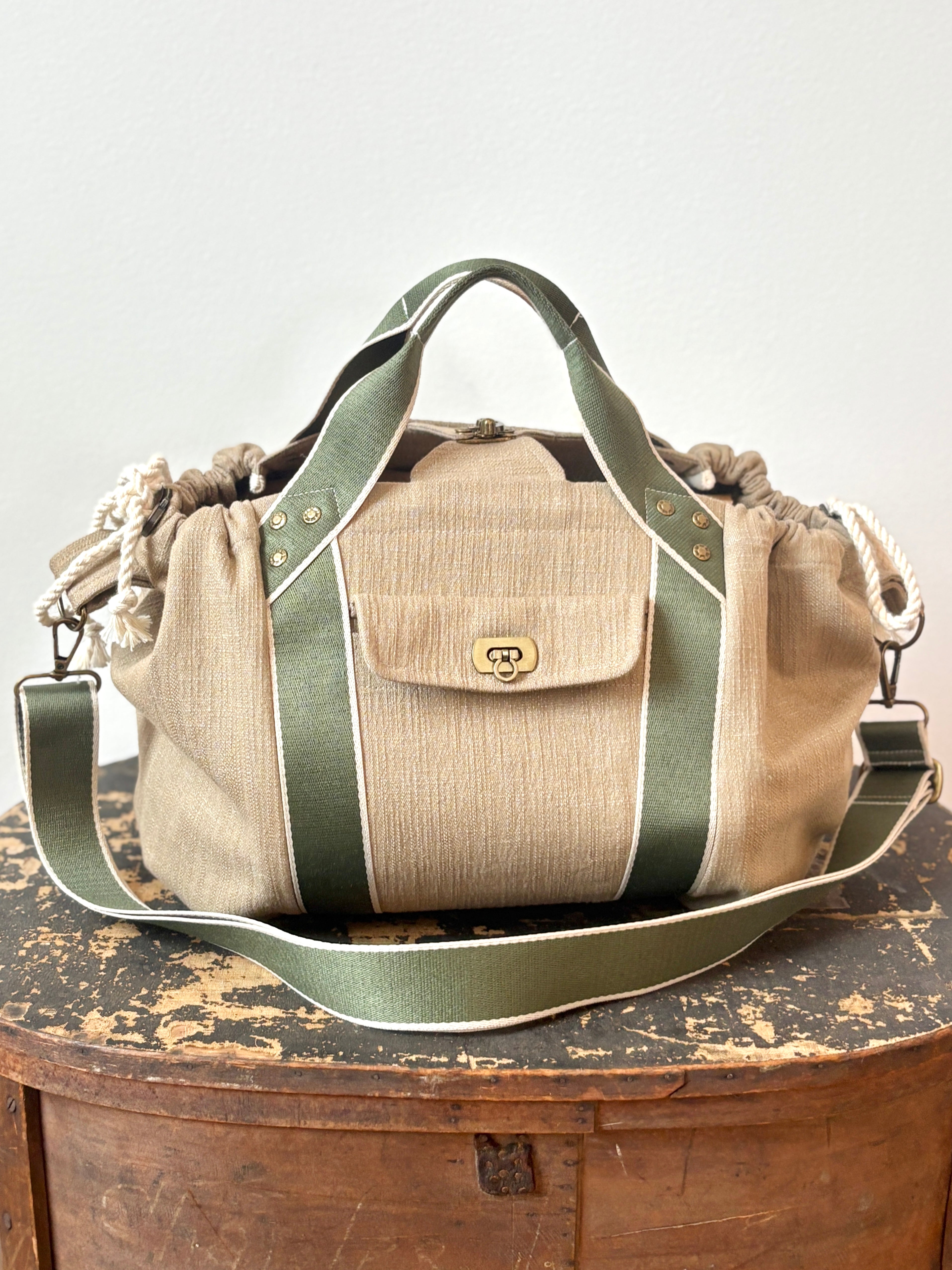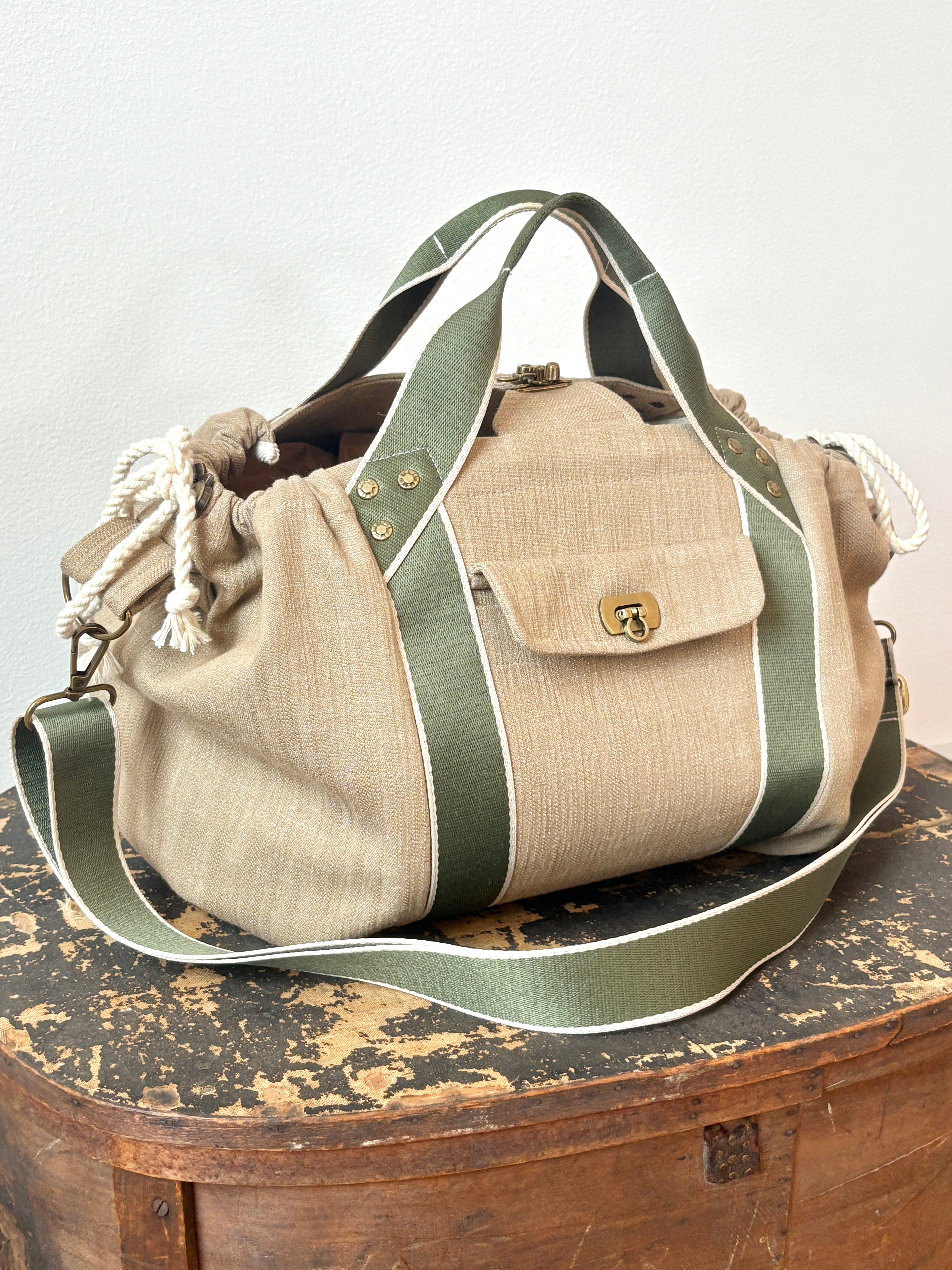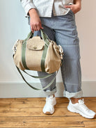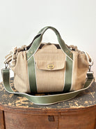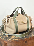 Mini Cross-Body Duffel Bag in Textured Khaki Denim with Olive and Cream Webbing