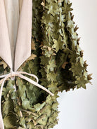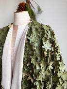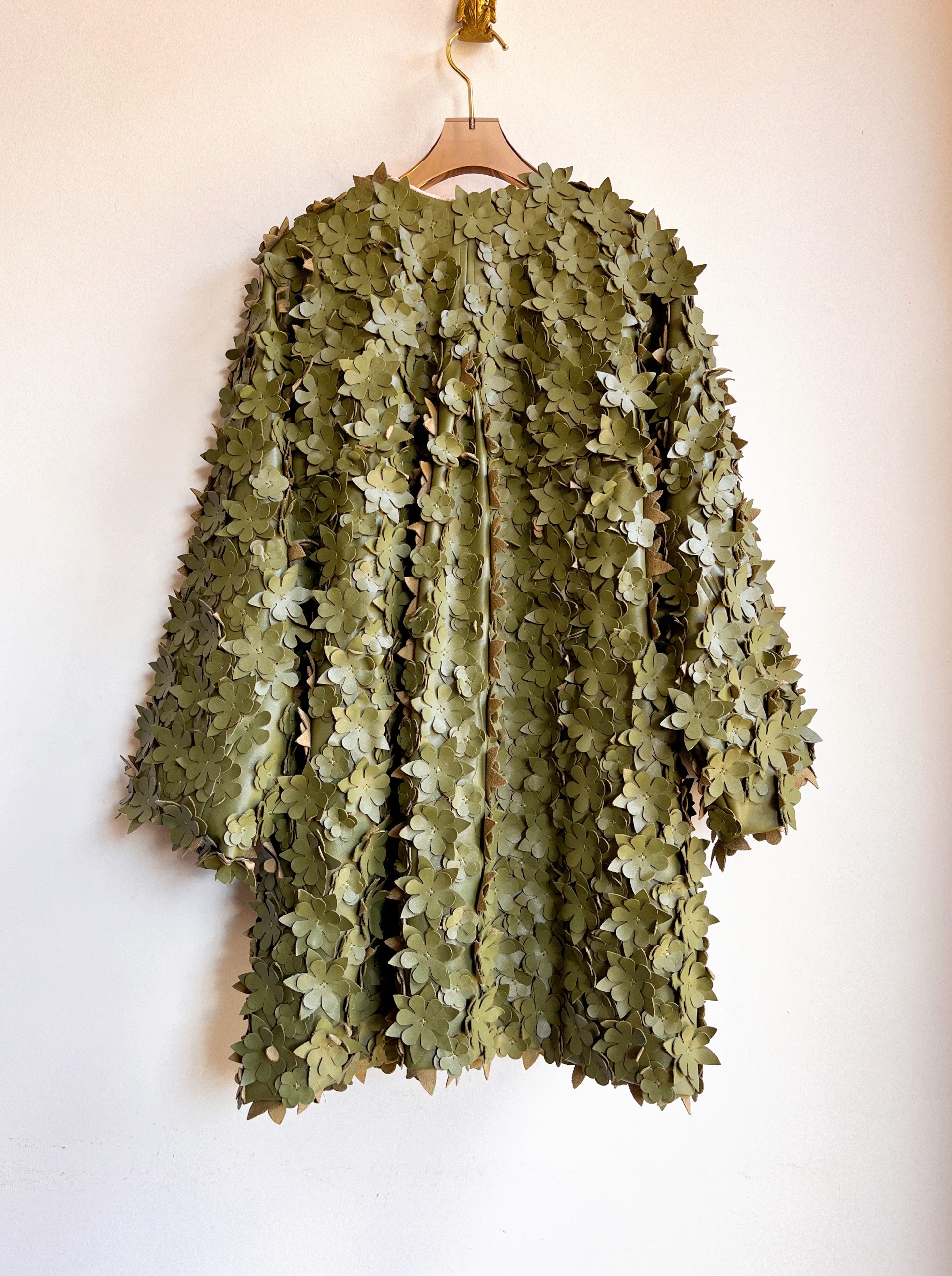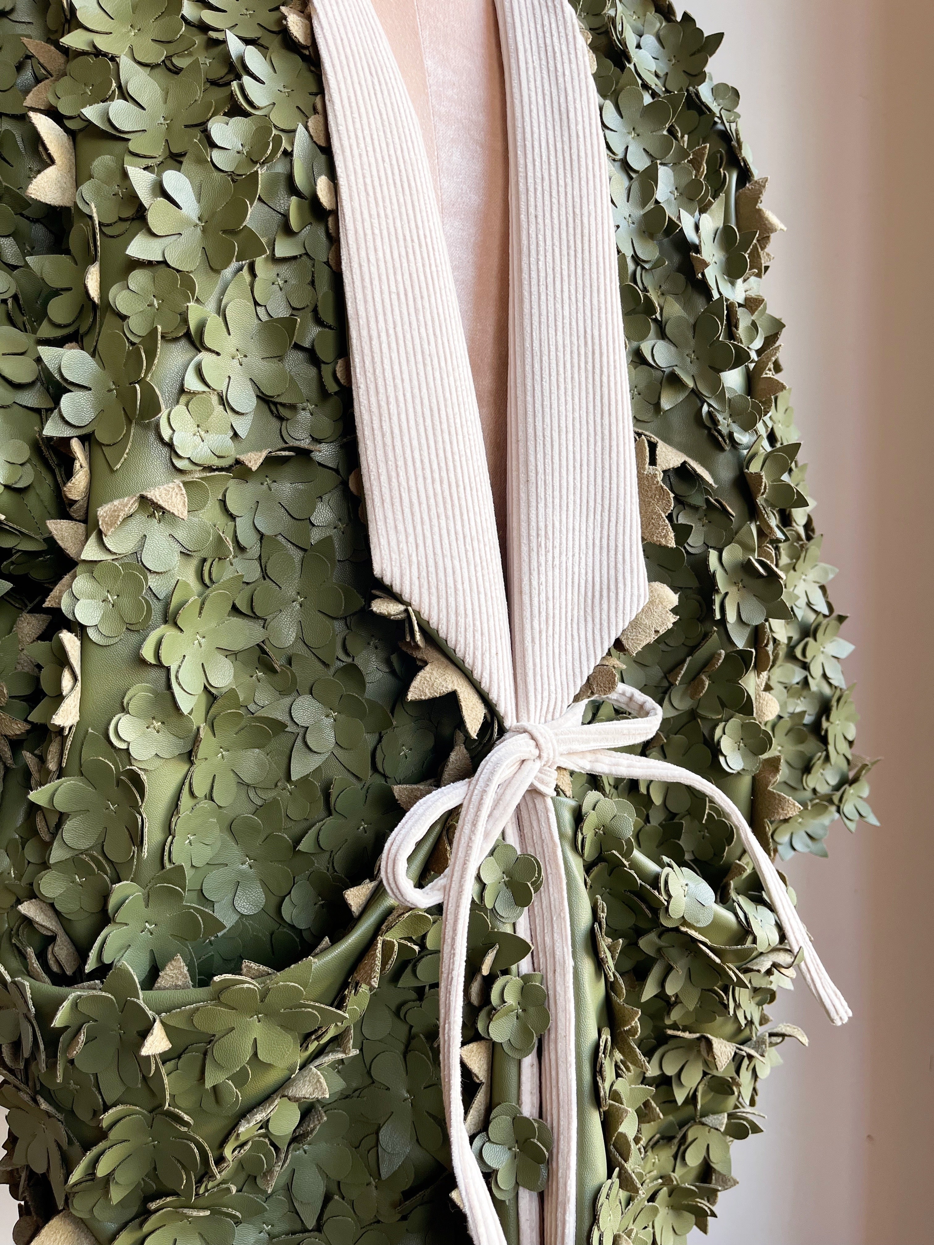 With its easy fit, folded lapel, front ties and square front pockets, our unisex Chore Jacket is a versatile statement piece that can be worn as outerwear or as you would a blazer or cardigan. This one is sewn from a specialty olive green faux leather, with sculptural flowers tacked onto the base. This jacket is a perfect addition into the holiday season and sure to be a stand out garment in your closet.