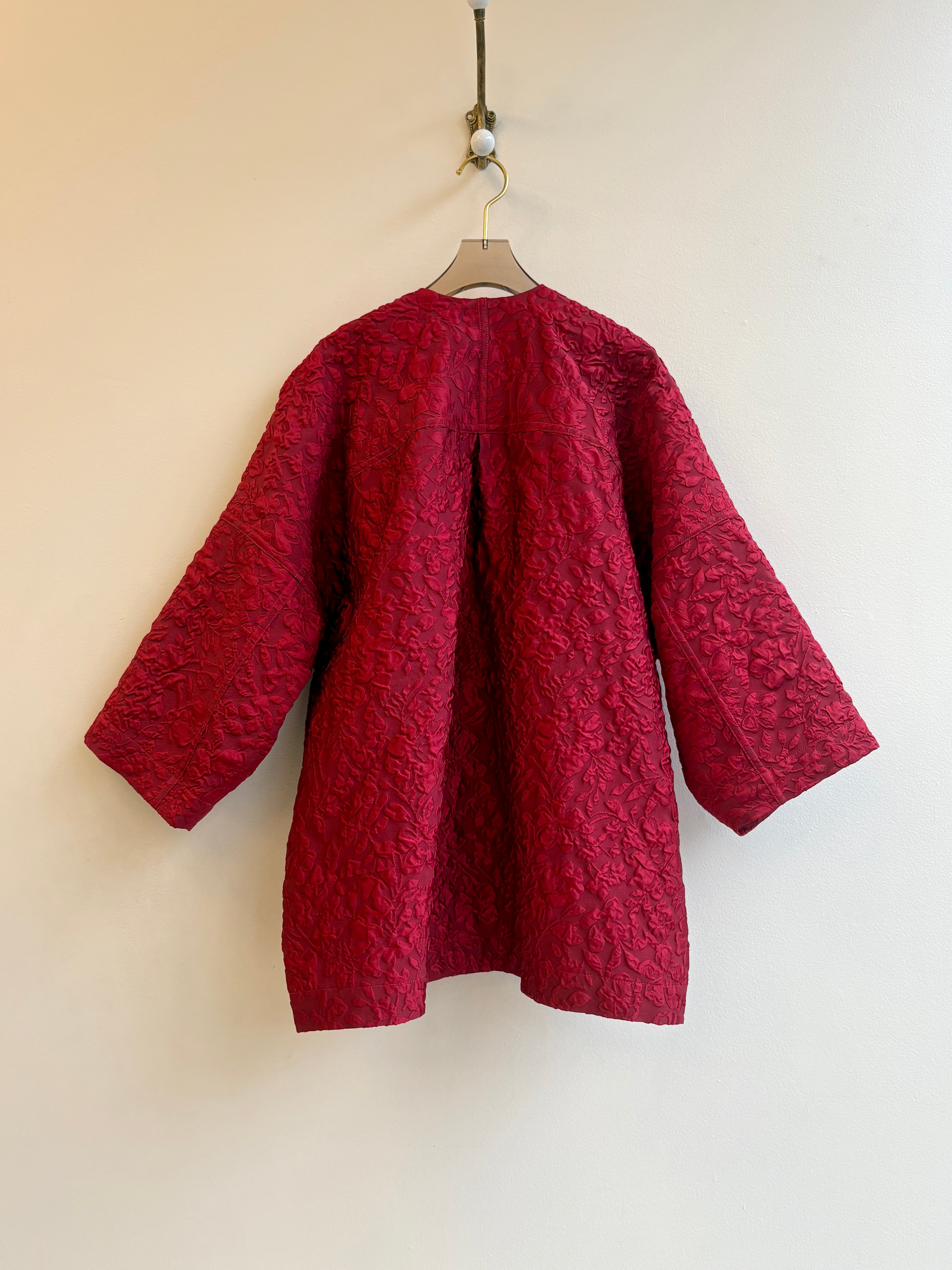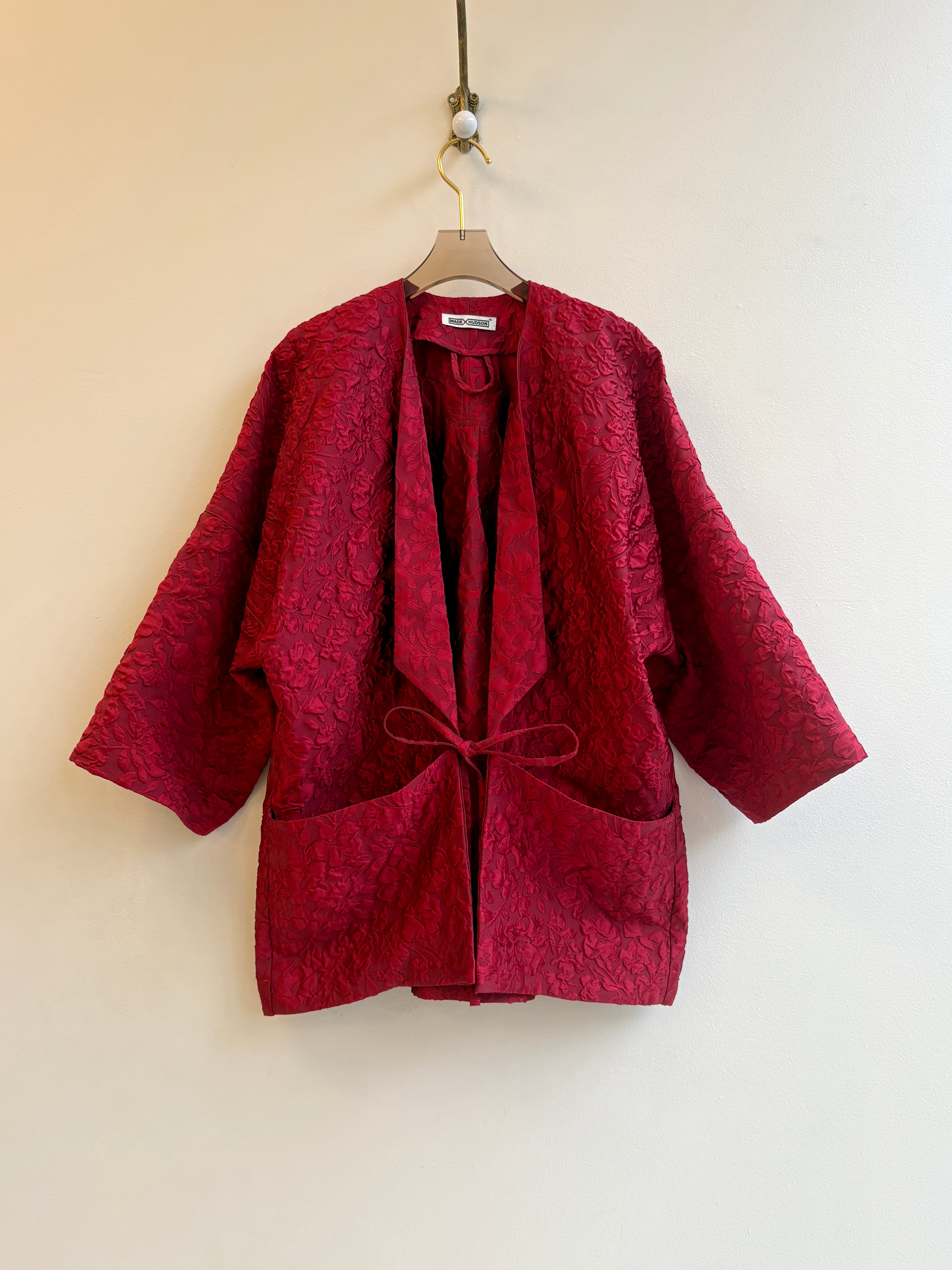 With its easy fit, distinctive origami pockets, folded lapel and front ties, our unisex Chore Jacket is a versatile statement piece that can be worn as outerwear or as you would a blazer or cardigan. This one is one-of-a-kind, sewn from a beautiful scarlet red crushed organza deadstock textile that’s perfect for fall and into the holiday season.
