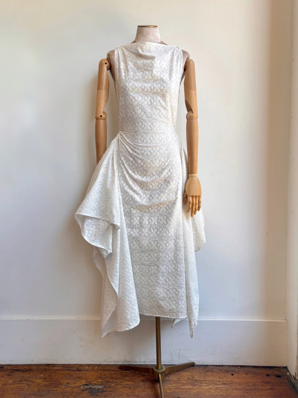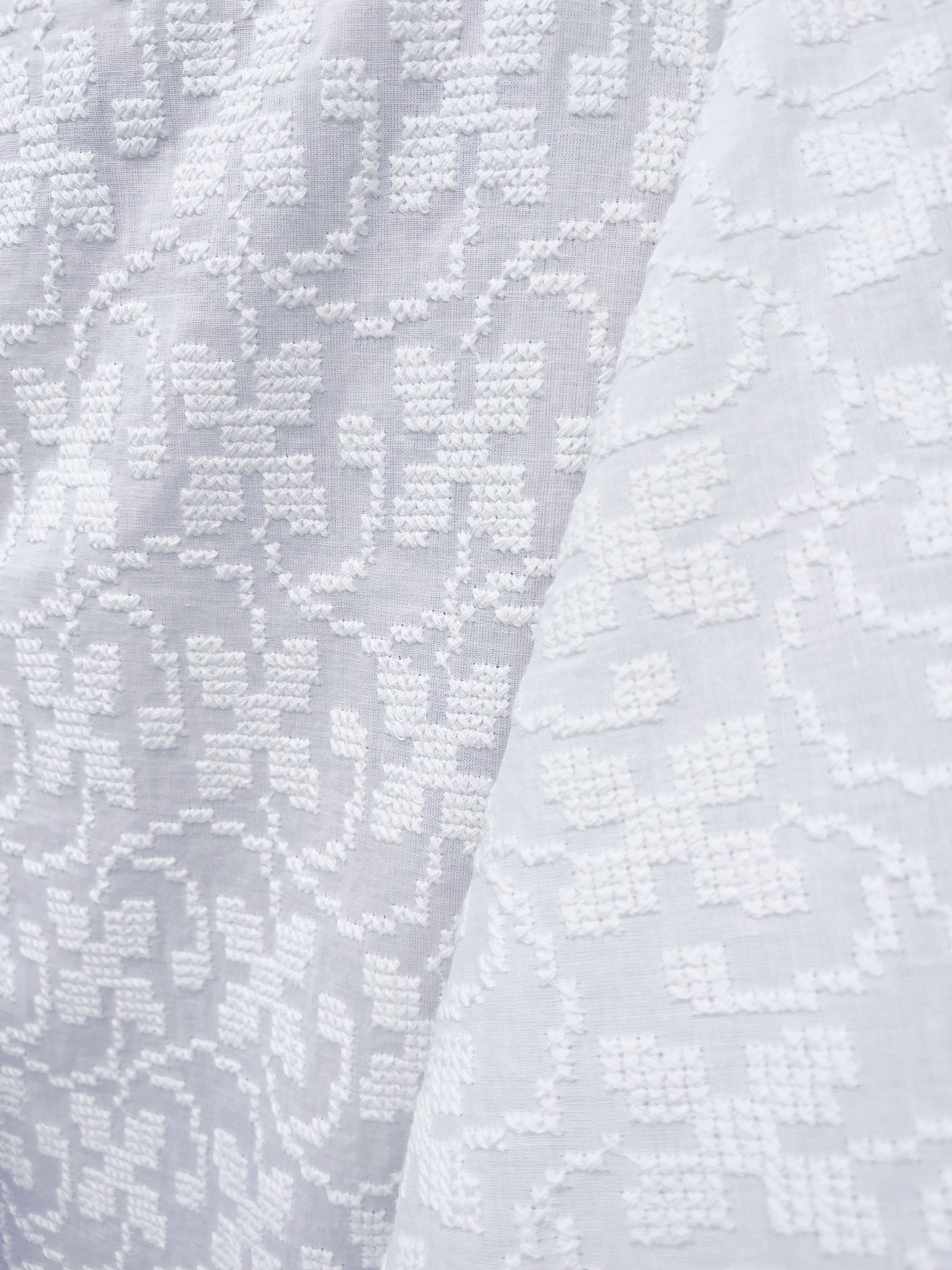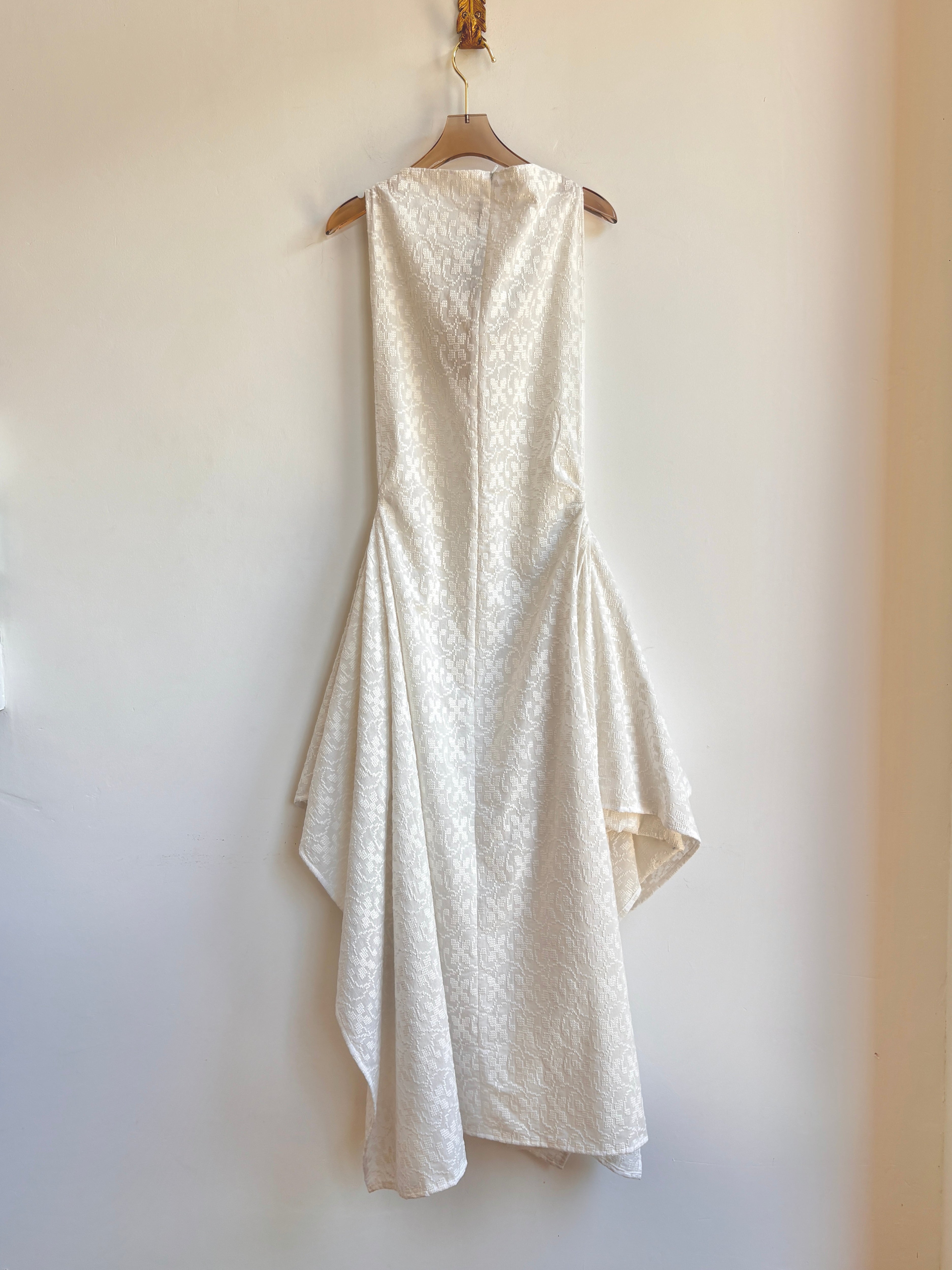 Our Zero-Waste Dress is so unabashedly pretty they tend to sell just as quickly as we can get one onto the floor. This one was sewn from a length of sheer white fabric with a geometric floral allover cross-stitched pattern, and it’s a real stunner. Dress it up for a party or wedding, take it for a walk barefoot on a beach, or throw on a jean jacket and sneakers for a day out and about.