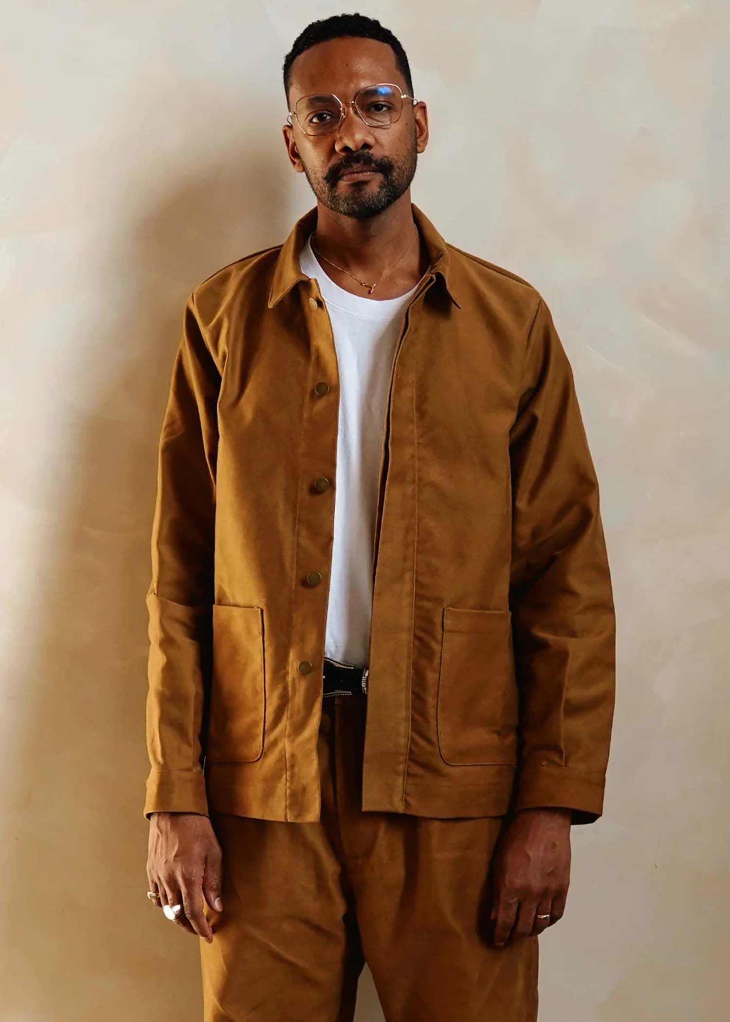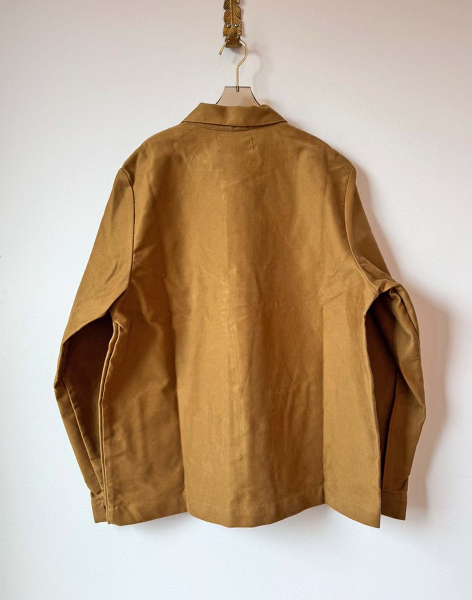 This chore coat by Of No Nation piece is incredibly versatile and great for transitional weather. Made from dead stock Japanese Moleskin means "mole fur" and refers to a soft twill fabric with a slightly fuzzy surface. Pairs perfectly with the New Sepoy Pants in dark khaki for a effortless work wear look.