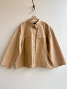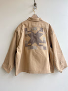This Olga Ella warm tan cotton shirt-jacket was once a mere work shirt. It’s been given new life and character with mock chest pockets, two lower functional lined patch pockets, re-tailored relaxed arm, and a tonal star quilt patch on the back in camel, warm brown, dark tan, and khaki.
