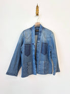 The denim pieces involved are different shades, and most or all are from other vintage garments. All of the wear and patina in the fabrics contributes to the unique character of the piece.