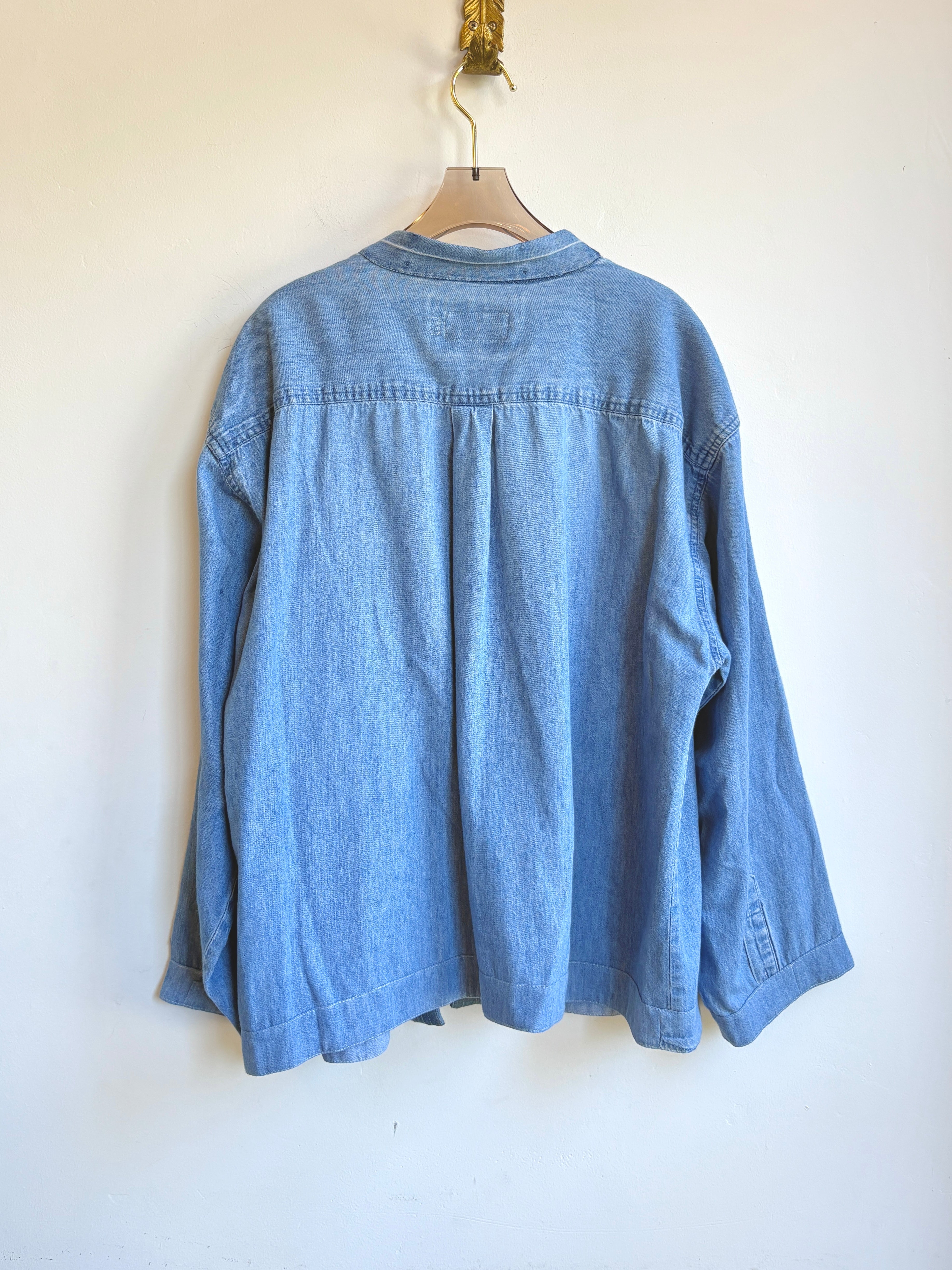 Olga Ella’s patchworked denim garments are works of textile art, and this one-of-its-kind jacket is no exception. It began life as a denim workshirt and has been reworked into a lightweight, open-front jacket with a shawl collar made from a grid of patchworked denim, giving a pixelated effect. A front pocket appears below the ghost of a former chest pocket, the arms are re-sewn for a relaxed fit.