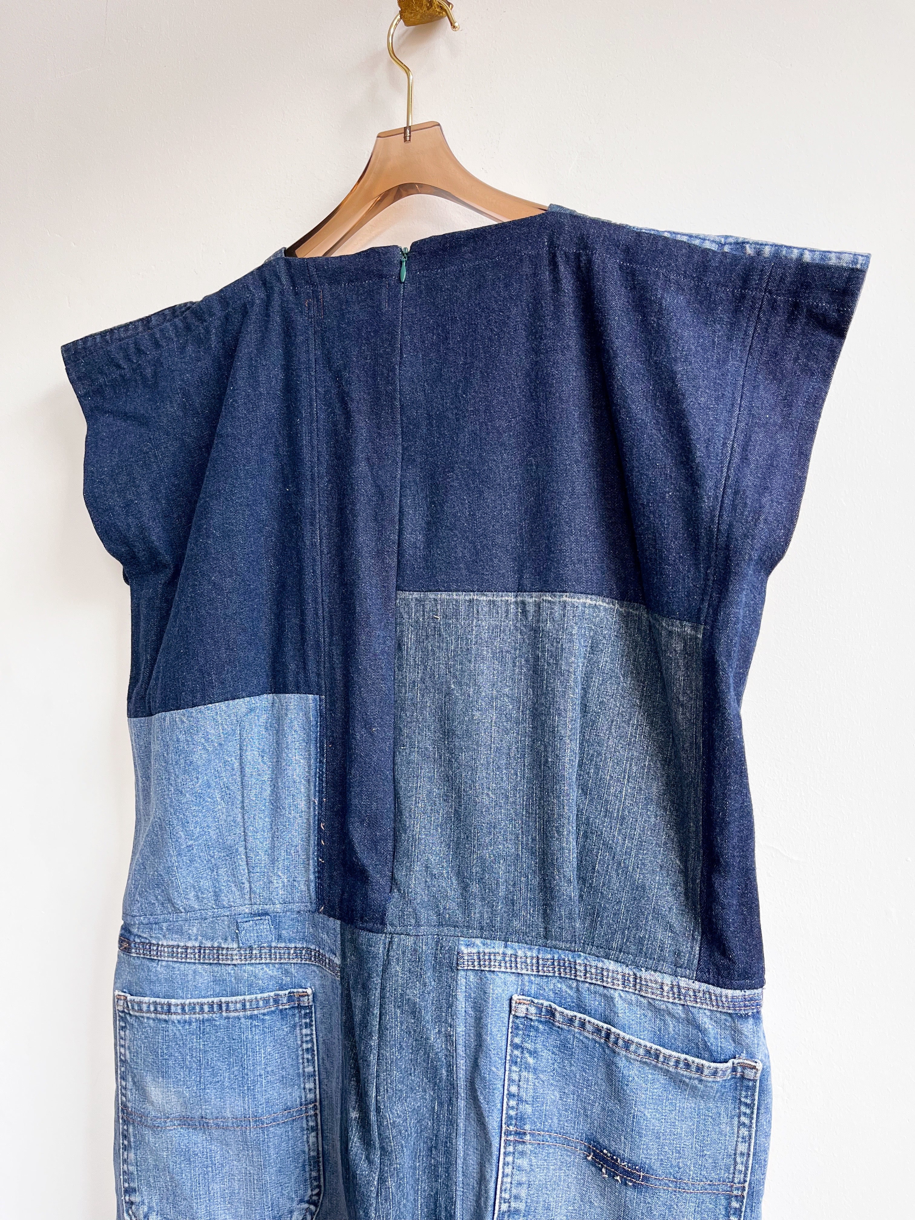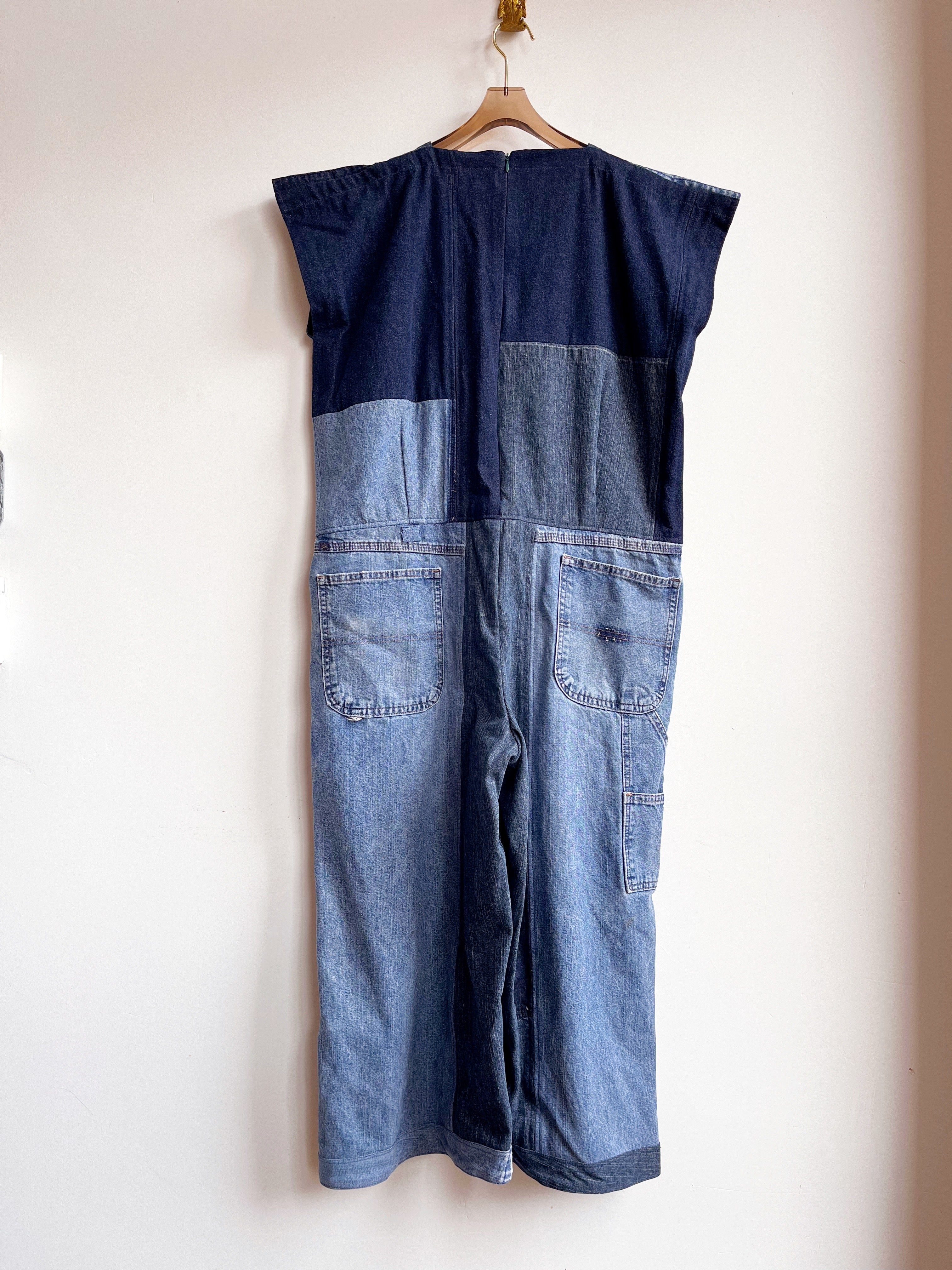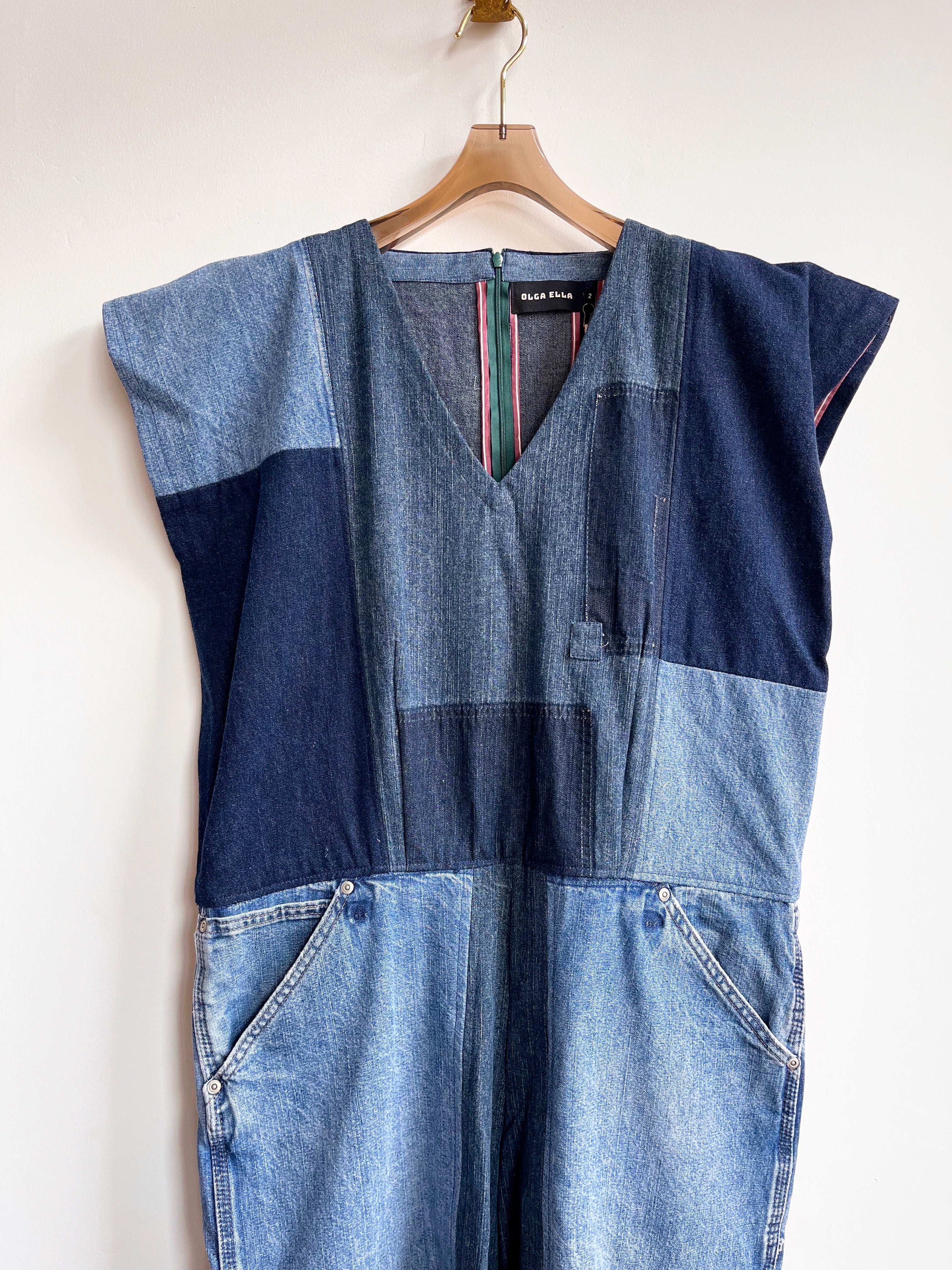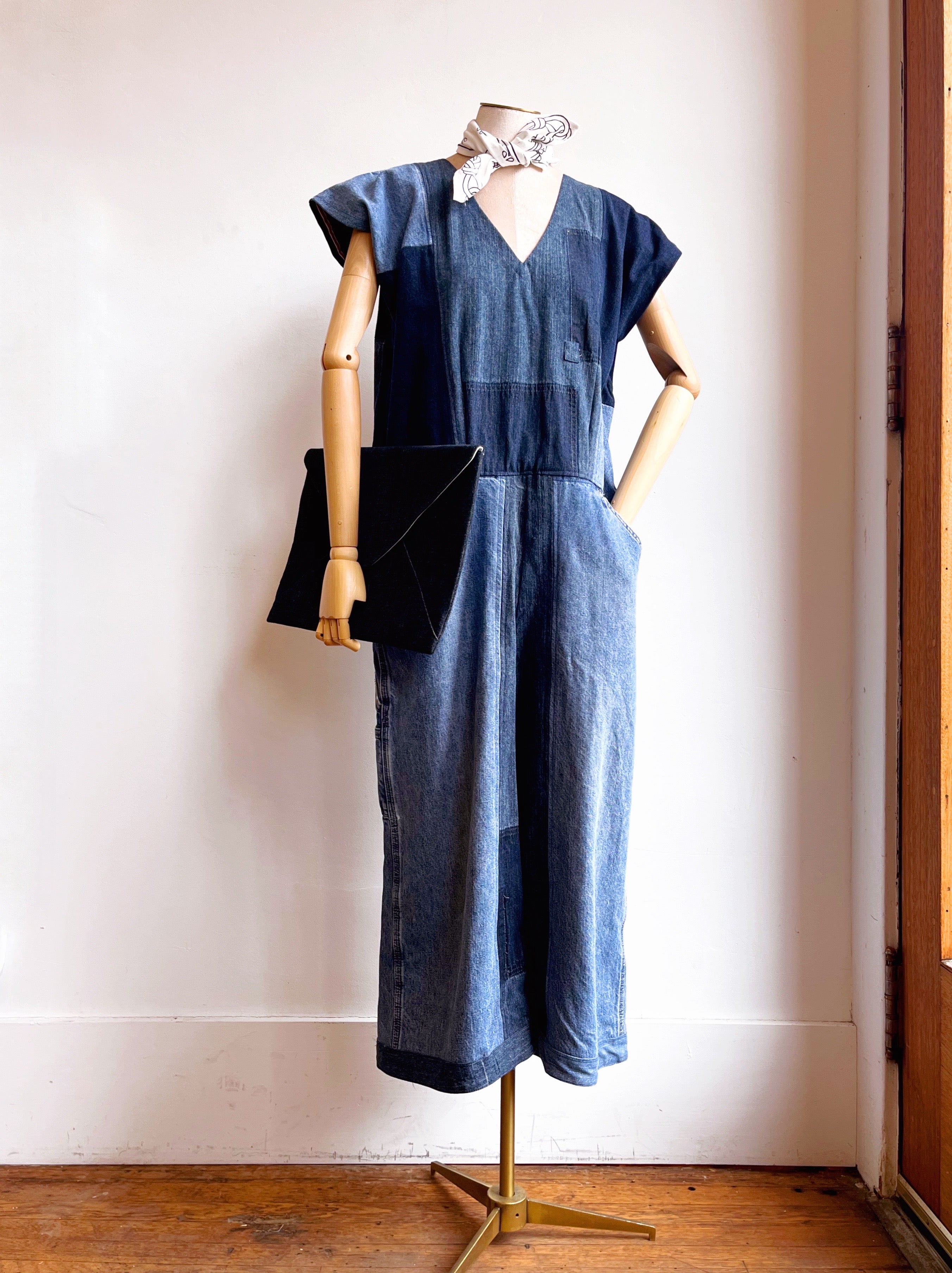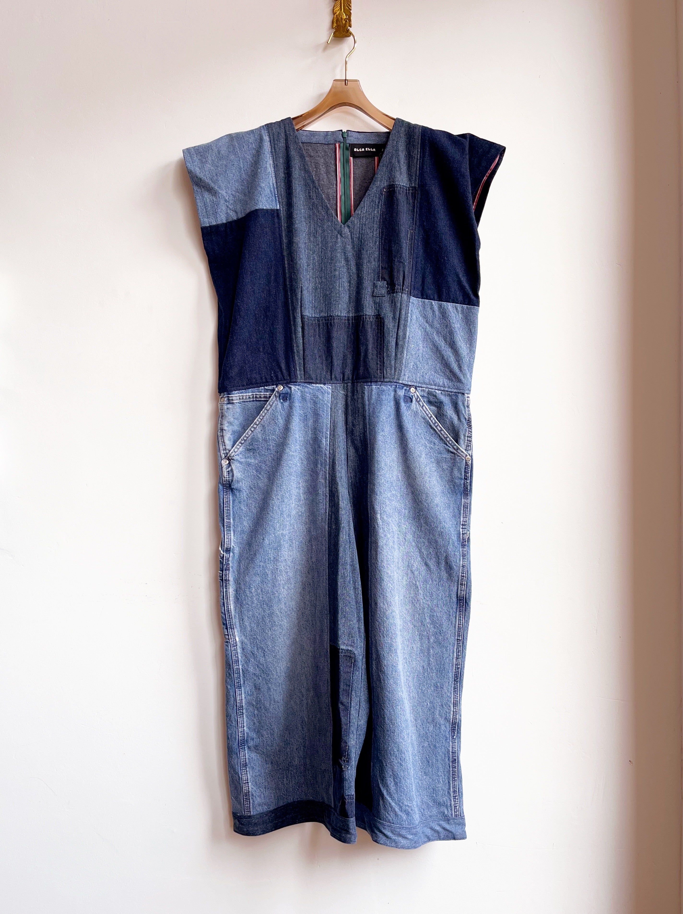Olga Ella’s patchworked denim garments are works of textile art, and this jumpsuit is no exception. It was created by deconstructing a pair of vintage jeans and recombining them with various other denim remnants into a one-of-its-kind, wide-legged, sleeveless jumpsuit. It has a V neckline and back zip for easy on/off.