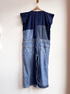 All of the denim pieces involved are different shades and many/most are from other vintage garments — all wear and patina in the fabrics contributes to the unique character of the piece.