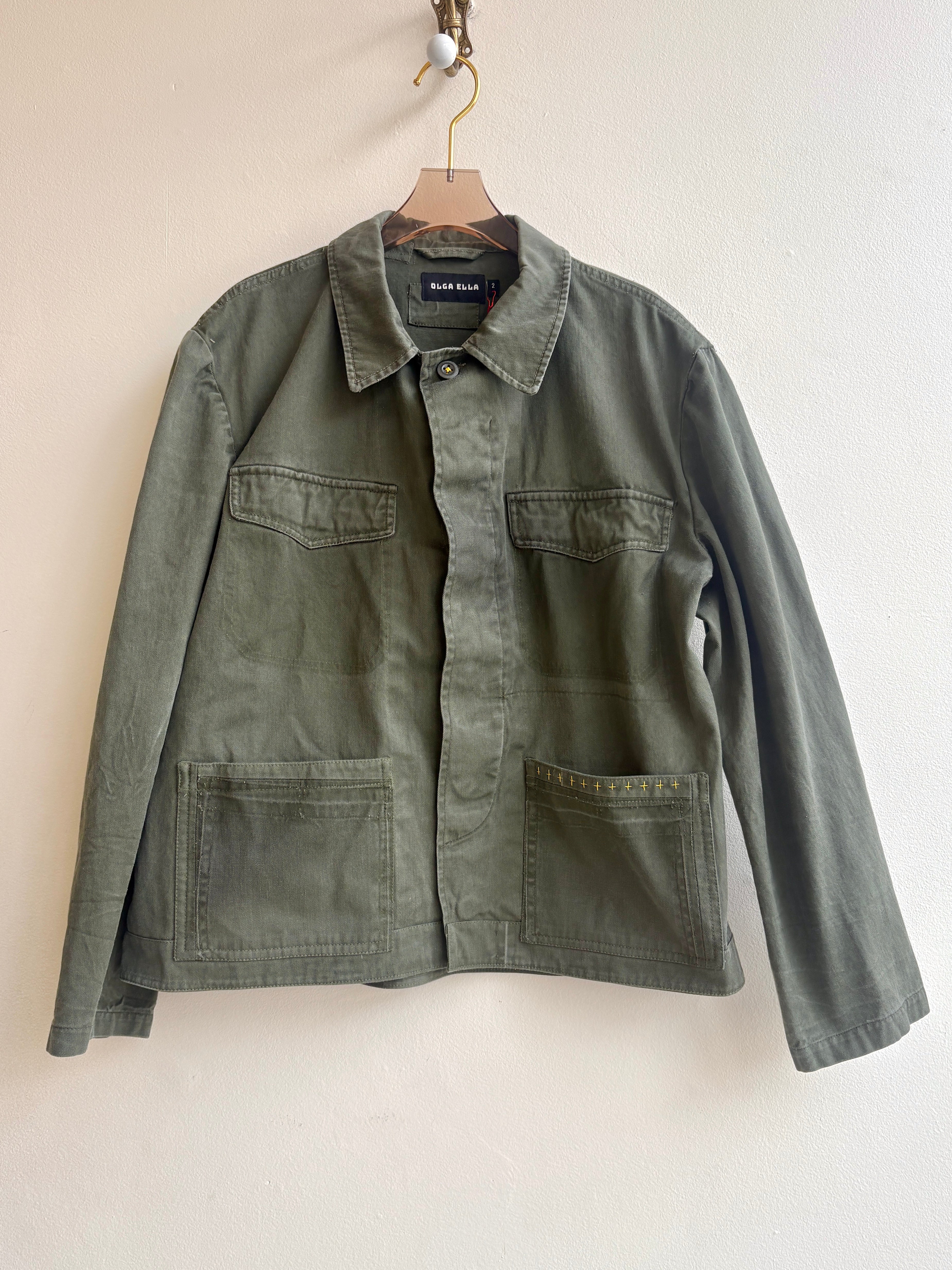 This Olga Ella fern green cotton shirt-jacket was once a jumpsuit. It’s been given new life and character with mock chest pockets, two lower functional patch pockets with yellow embroidery detail, a re-tailored relaxed arm, and tailored back.