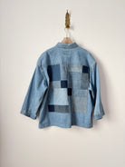 This Olga Ella three pocket denim shirtjacket was once a mere work shirt. It’s been given new life with added denim pockets, relaxed tailored arm, and a back patch made of squares of toned denim.