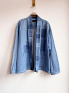 Olga Ella’s patchworked denim garments are works of textile art, and this one-of-its-kind jacket is no exception. It began life as a denim workshirt and has been reworked into a lightweight, open-front jacket with a shawl collar made from a grid of patchworked denim, giving a pixelated effect. A front pocket appears below the ghost of a former chest pocket, and additional blocks of denim are appliquéd and patched in, visible-mending style.