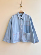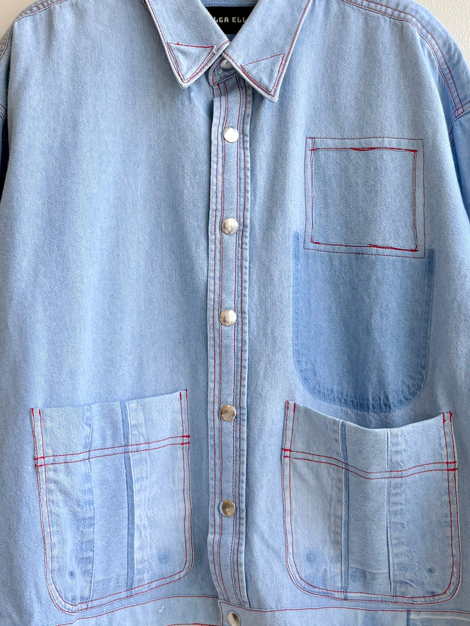 This Olga Ella patchworked denim shirtjacket was once a mere work shirt. It’s been given new life with a straight hem and added denim pockets with red top stitching