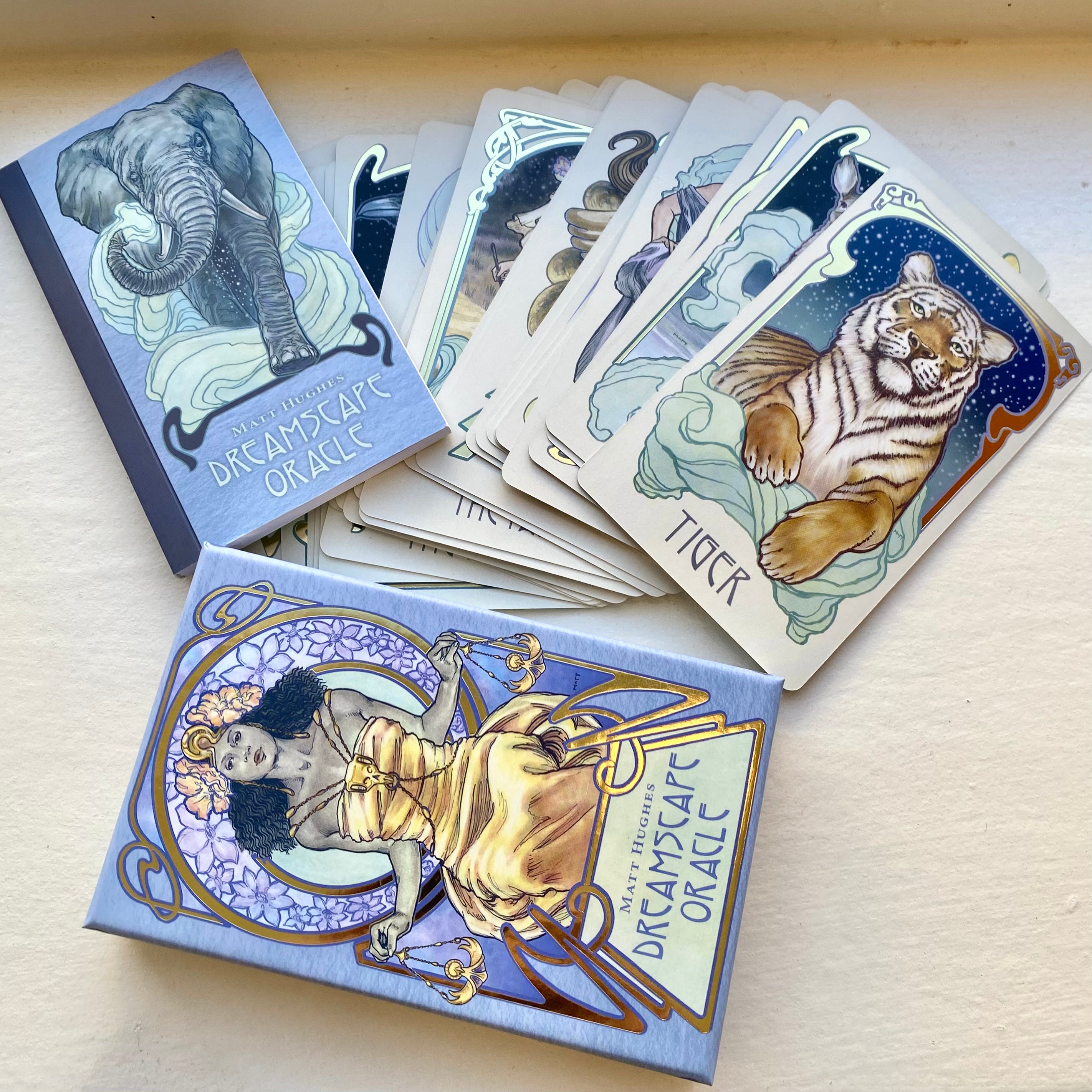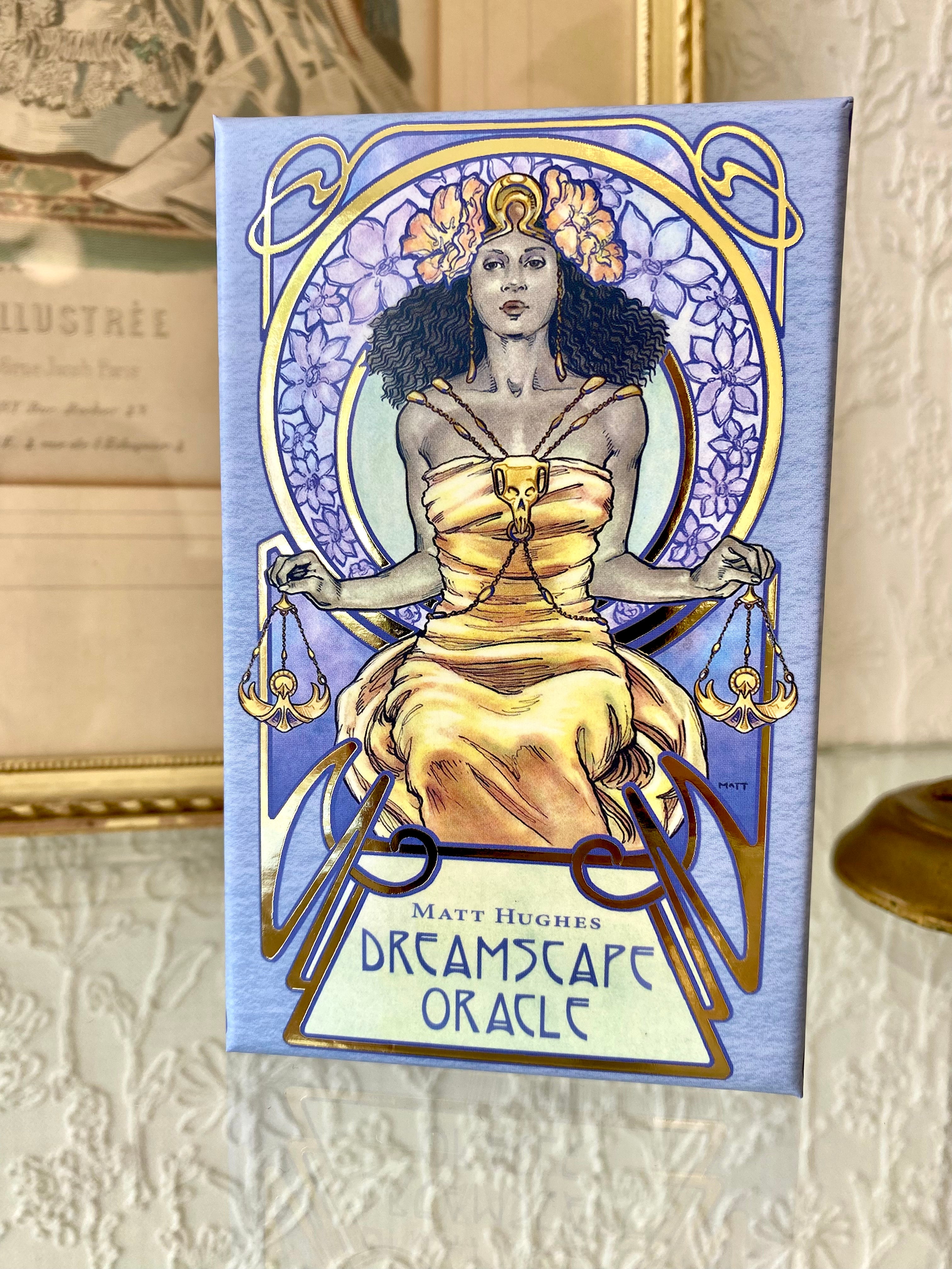Dreamscape Oracle Deck by Matt Hughes presents 32 guides, some animal messengers, some mythological archetypes, to help us explore the liminal space in our lives. This deck can be used as a stand-alone, divination deck, or as a companion to the Ethereal Visions Tarot. In his iconic art nouveau style, these are spell binding invitation into the subconscious, where we see the unseen and comprehend the incomprehensible.