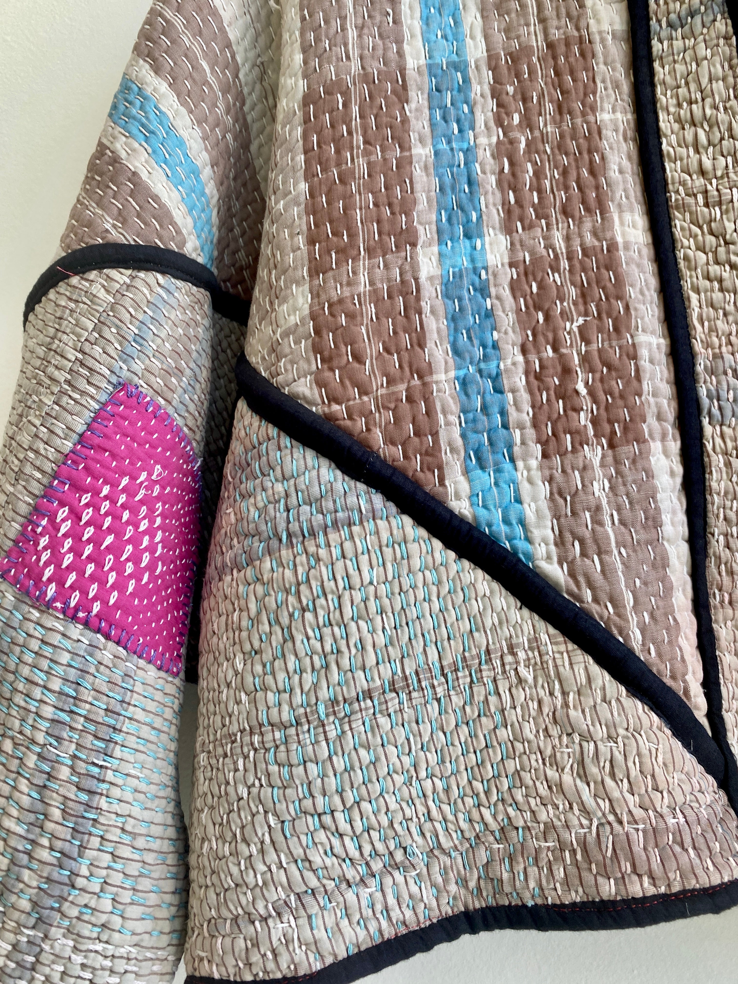 Vintage Kantha quilts — Indian patchwork, meticulously hand-quilted with running stitch — get new lives as fully reversible tote bags and jackets that show off all that heritage handwork.