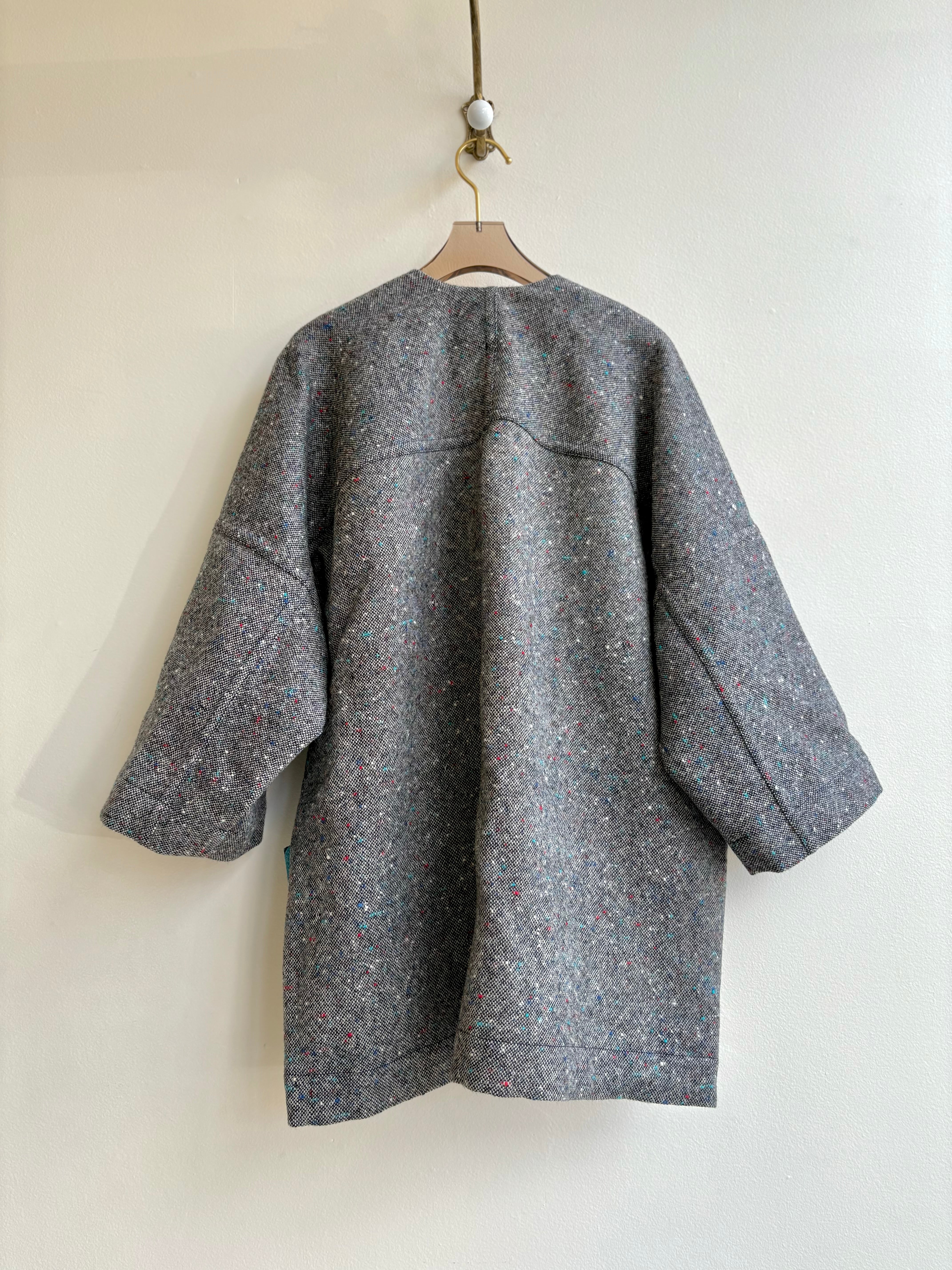 With its easy fit, distinctive pockets, folded lapel and front ties, our Chore Jacket is a versatile statement piece that can be worn as outerwear or as you would a blazer or cardigan. This version is combined multi color tweed fabric from our Regina Collection and a floral kimono.
