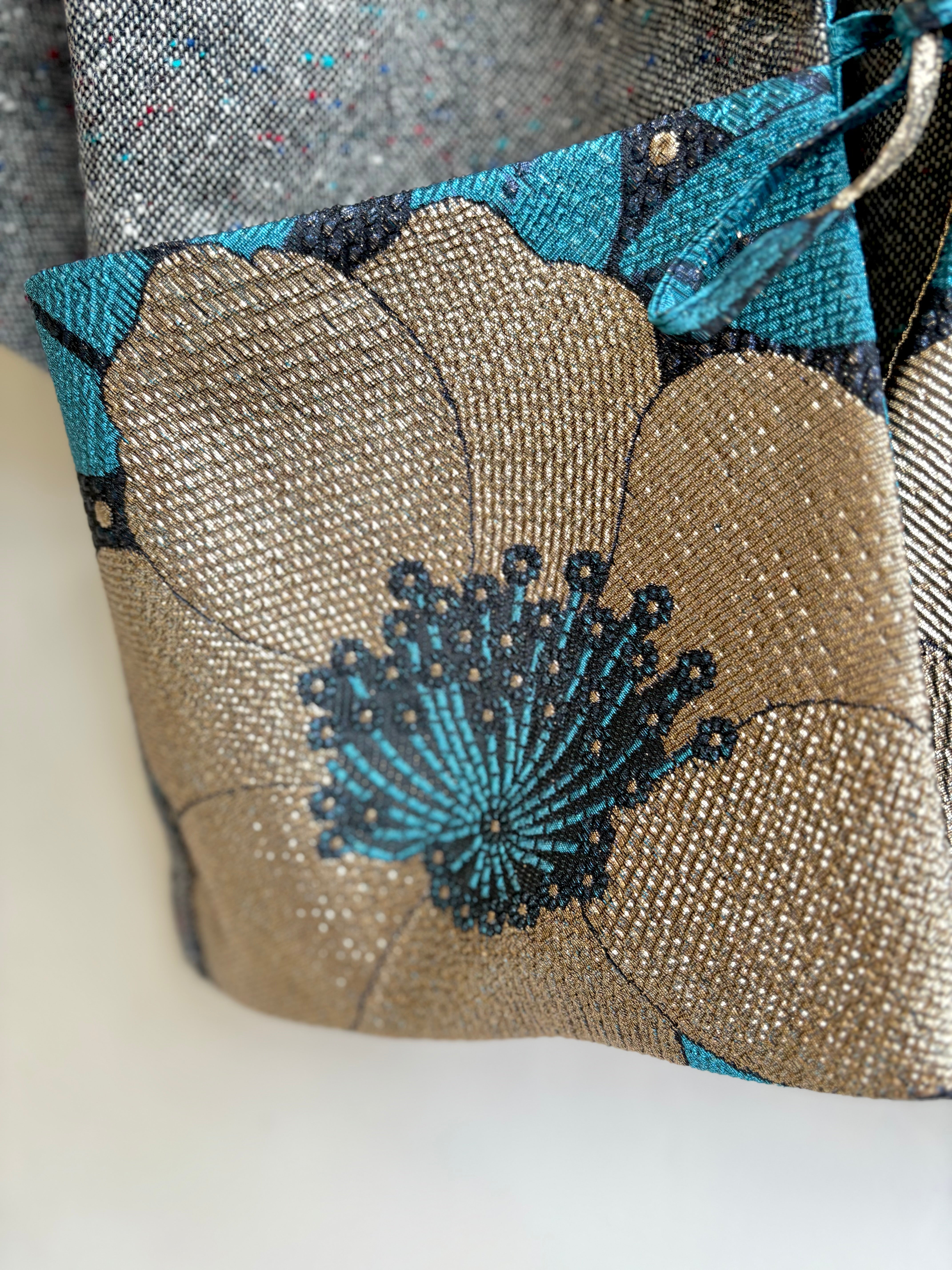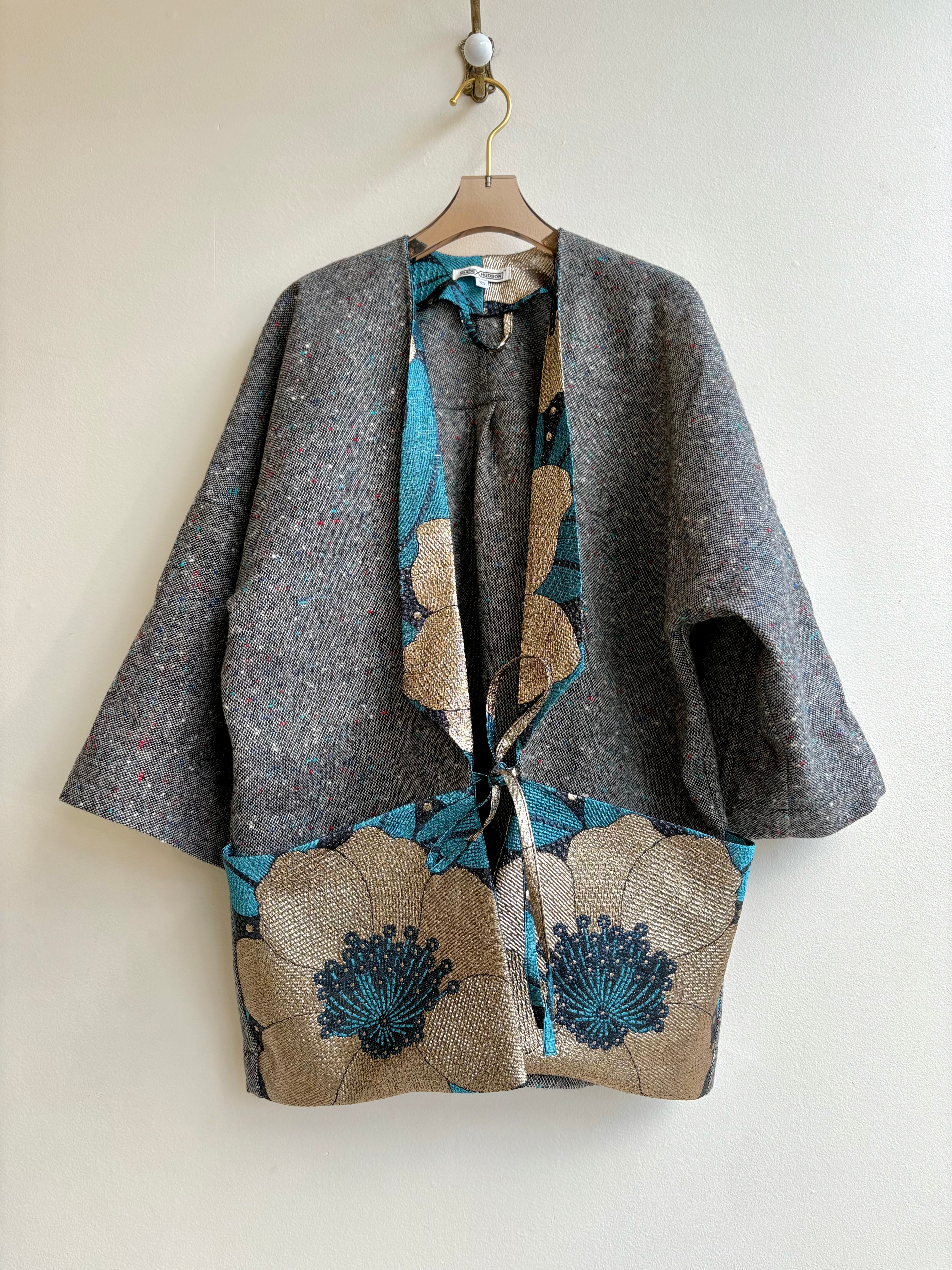 - Remnant floral kimono fabric combined with vintage mid-century tweed fabric, from our Regina Collection