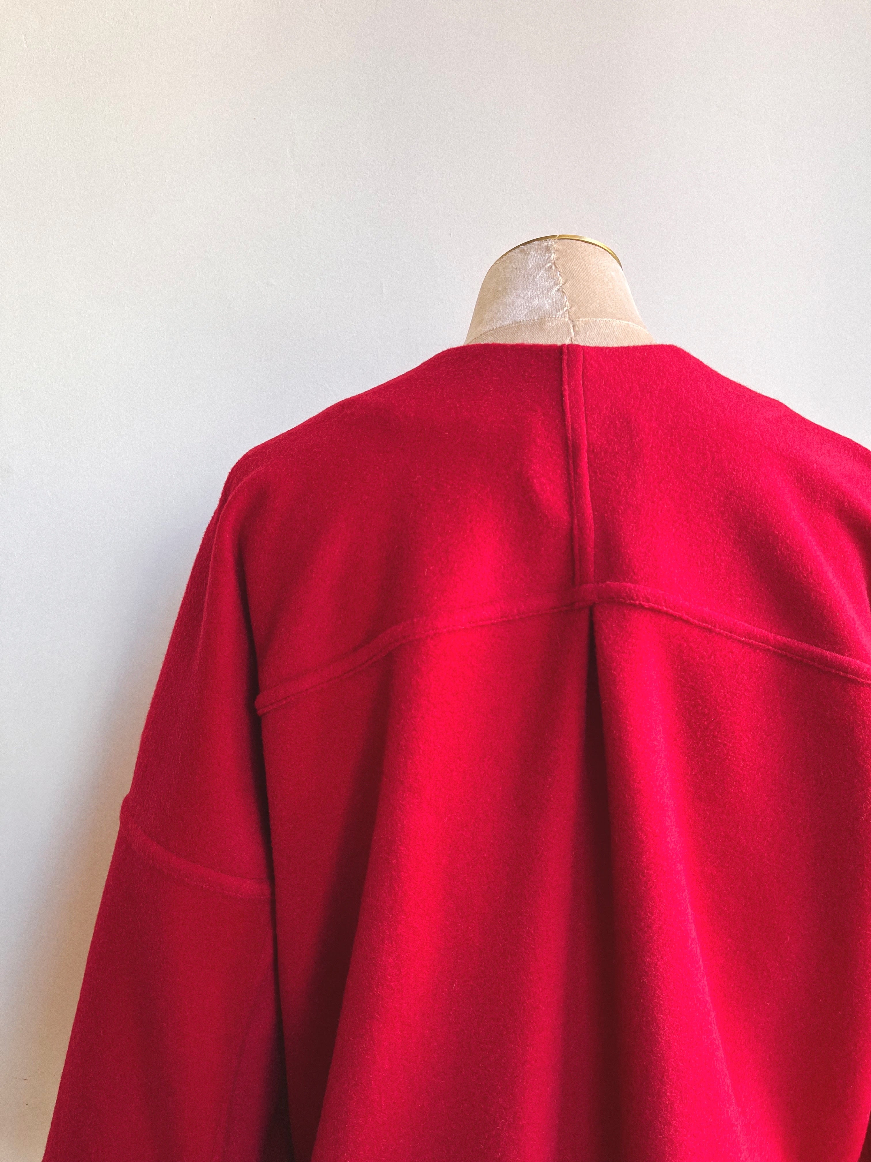 With its easy fit, distinctive pockets, folded lapel and front ties, our unisex Chore Jacket is a versatile statement piece that can be worn as outerwear or as you would a blazer or cardigan. This version is a comfy cozy dream in this red wool-cashmere blend fabric from our Regina Collection.