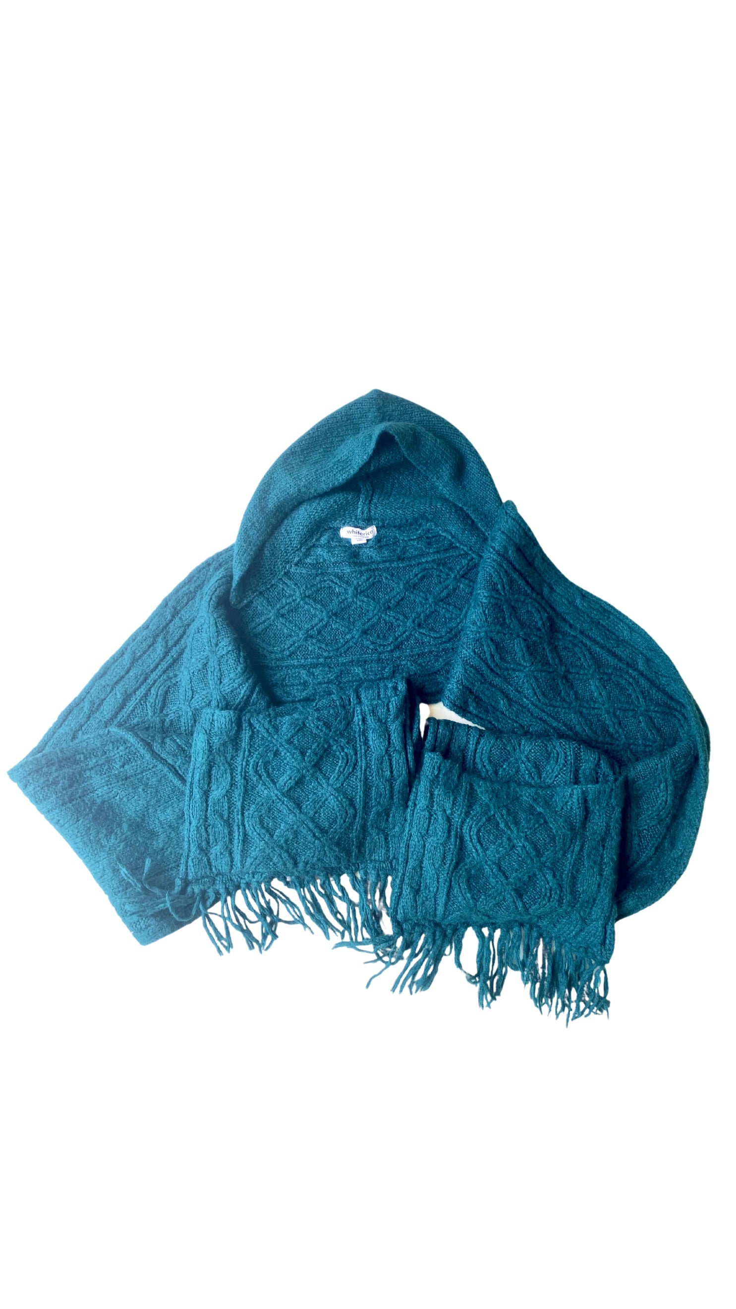 Crafted with a versatile forest green color, this scarf features a convenient hood and pockets on each side. Keep warm and stylish with this acrylic green scarf, perfect for any occasion.