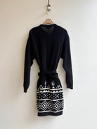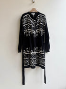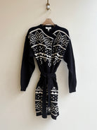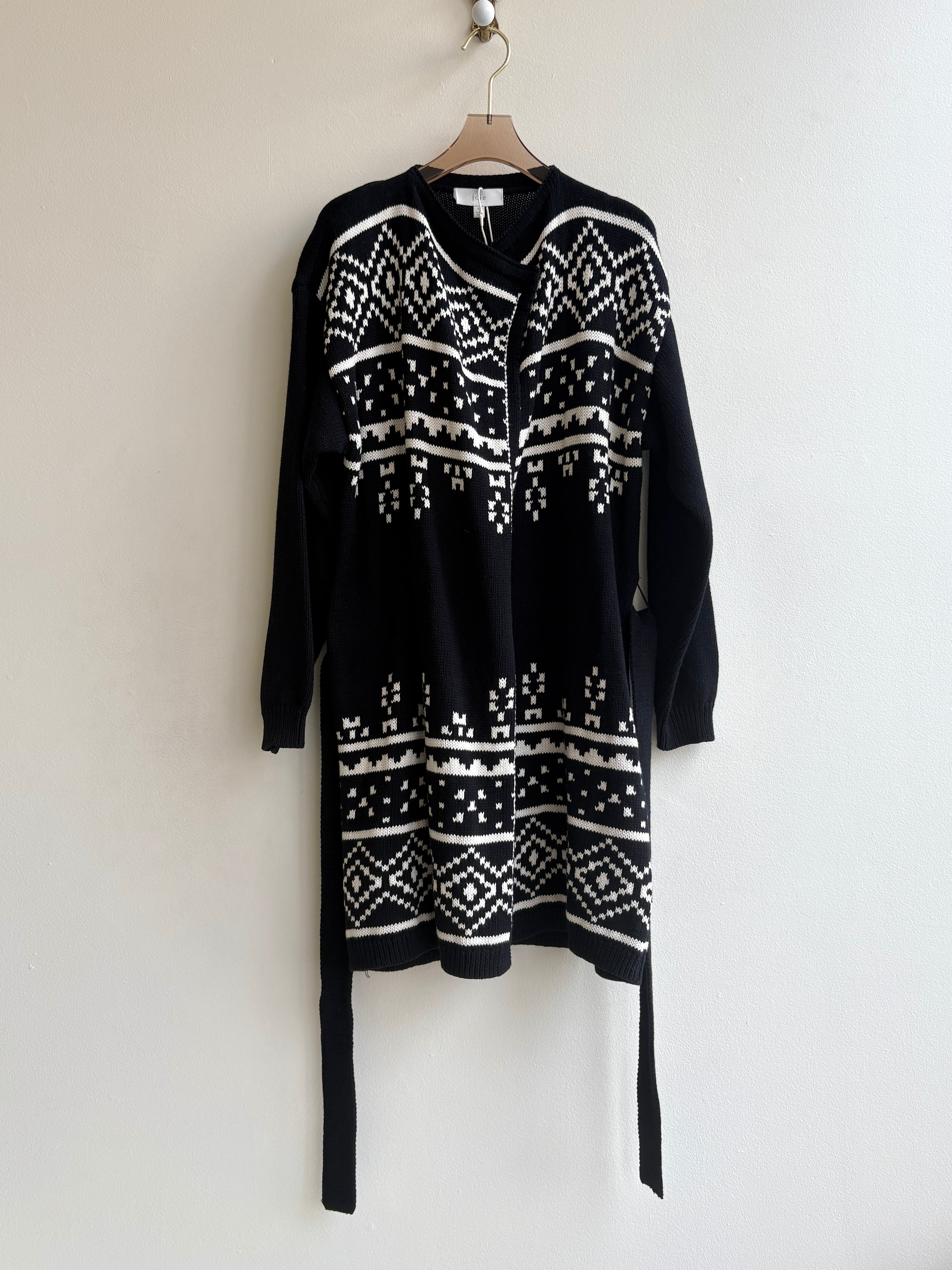 - Black and white knit cardigan with alternating geometric patterns on shoulder front panels and around the bottom hem