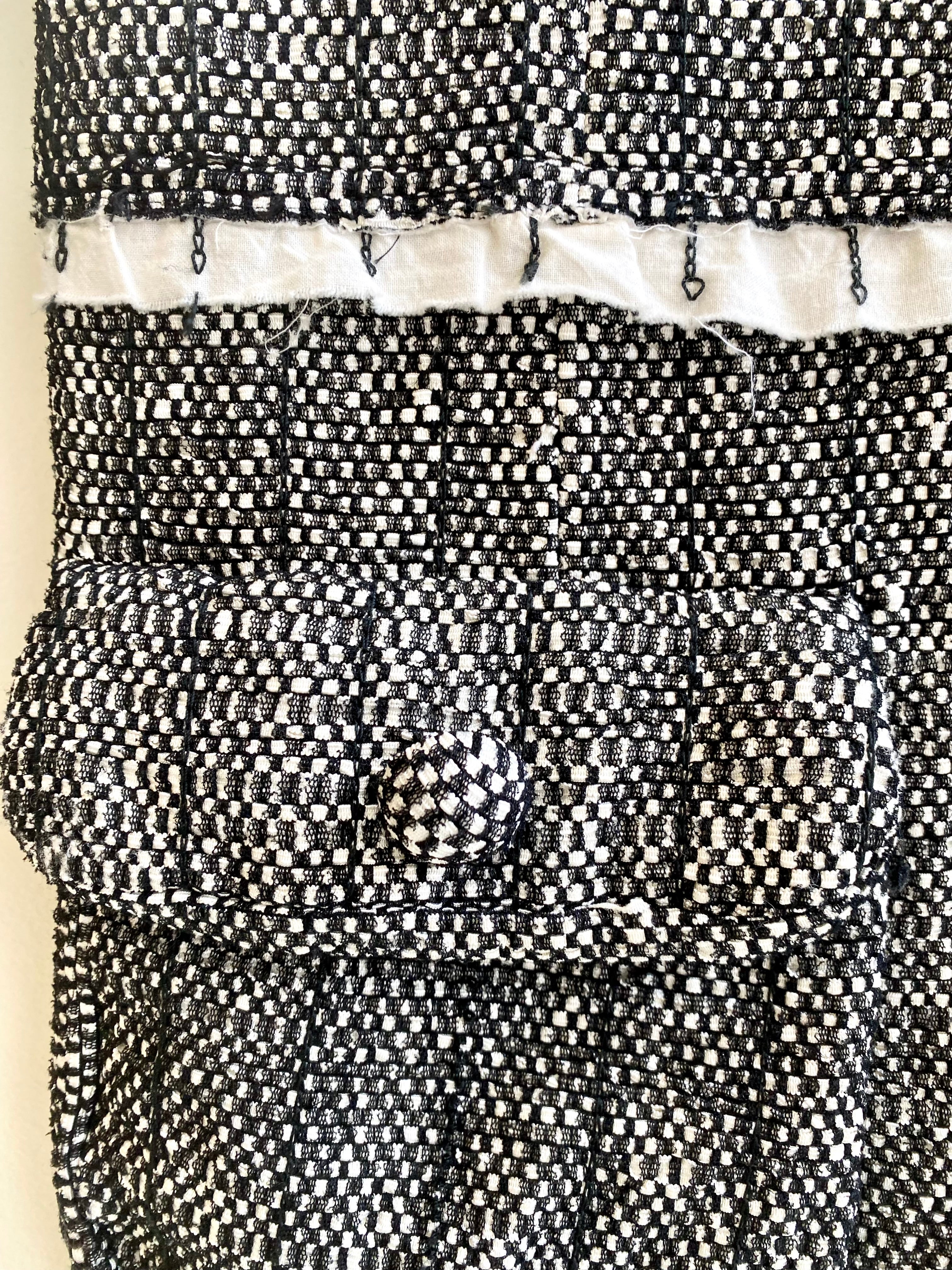 This coat is a unique find by Sergio Vintage, a runway Marc Jacobs in black and white patterned faux tweed fabric. Features large sculptural pockets, snap buttons, cotton breaks in fabric texture, quilted interior.