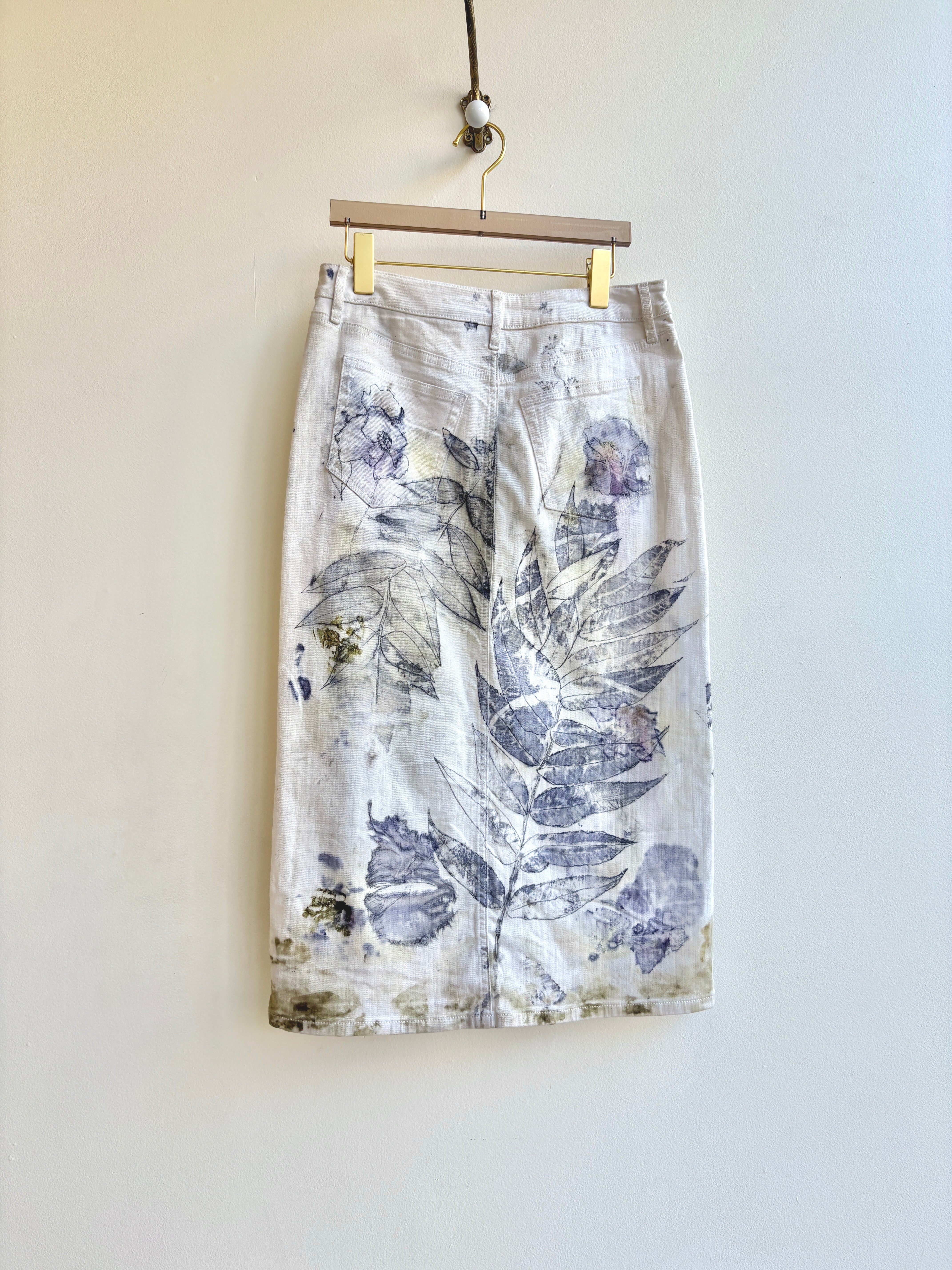 Plum & Green Denim Long Eco-Printed & Hand Drawn Skirt (Reworked)