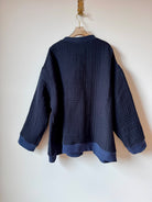Make a bold yet refined statement with this hand woven sweater from Shino NYC. In autumnal tones, this sweater is intricately woven in small, color mixed cubist pattern with navy sashiko quilted sleeves and side panels. Soft navy knit ribbing at neck, sleeves and waist.
