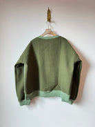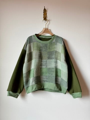 Make a bold yet refined statement with this hand woven sweater from Shino NYC. In verdant forest green, pale blue, and gray, this sweater is intricately woven in large cubist patterns with medium green quilted sleeves. Soft knit ribbing at neck, sleeves and waist.