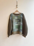 Make a bold yet refined statement with this hand woven sweater from Shino NYC. In olive green, pale blue, and gray, this sweater is intricately woven in large cubist patterns with olive green quilted sleeves. Soft knit ribbing at neck, sleeves and waist.