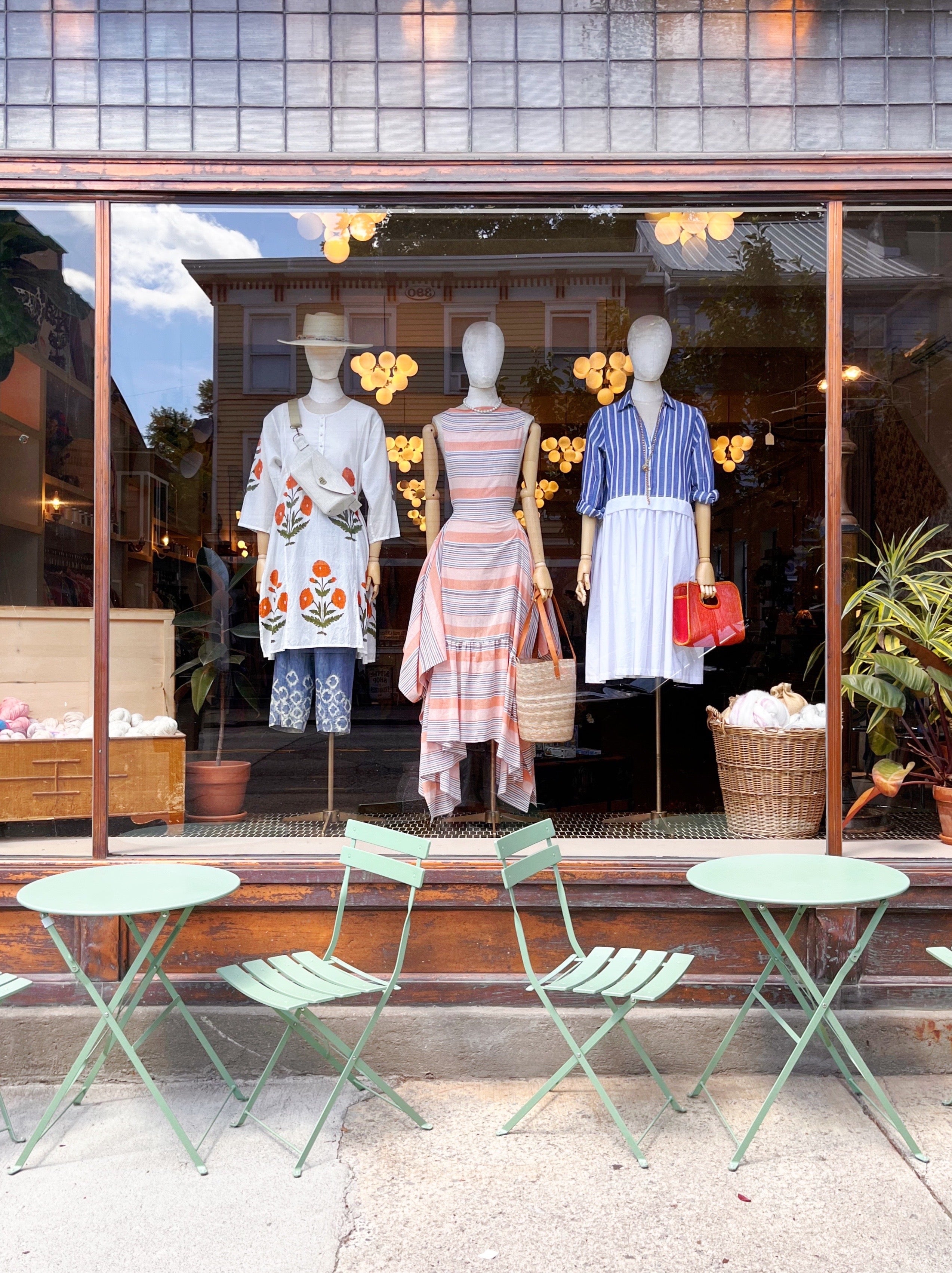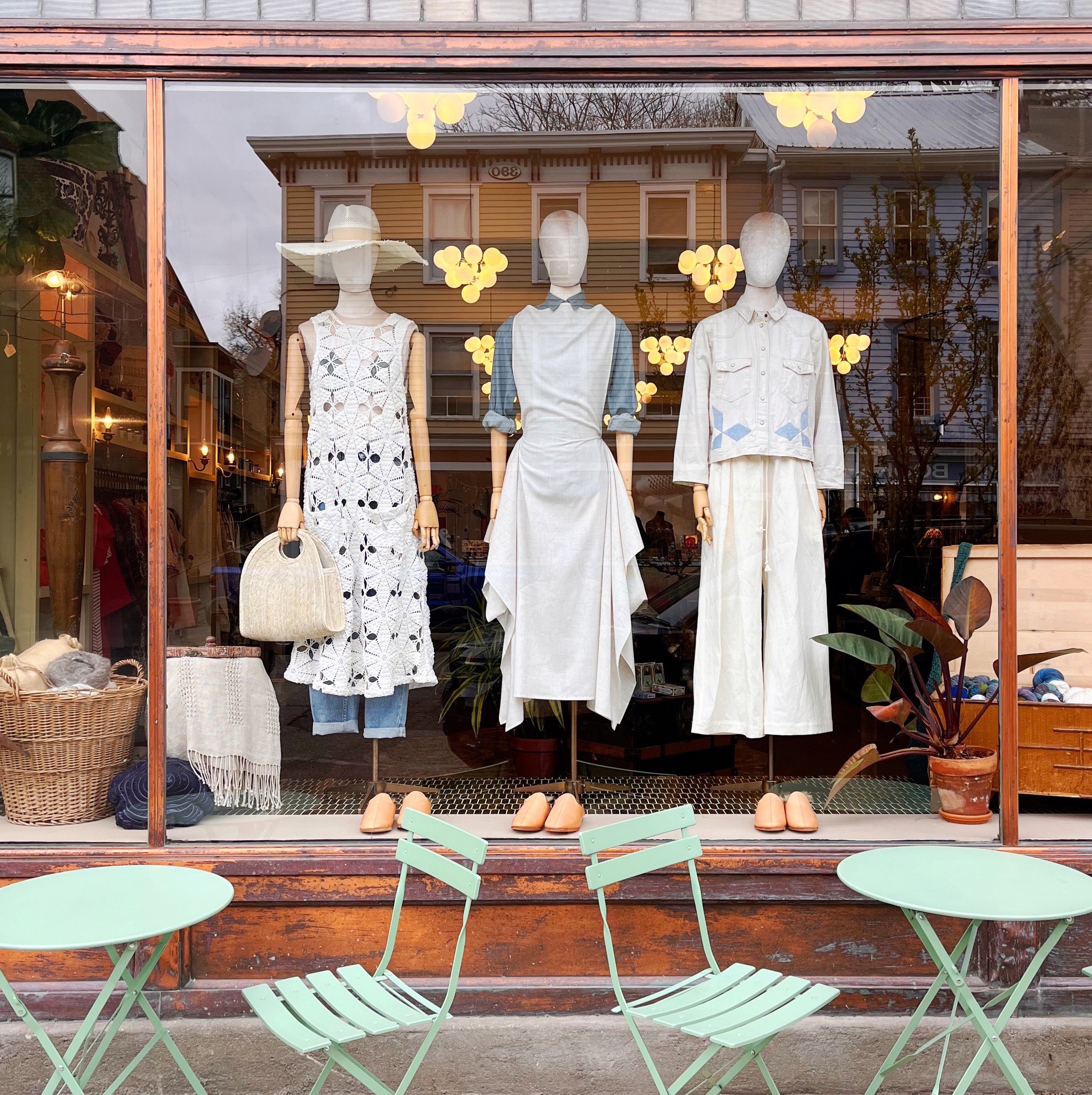 For the last window until Christmas, our Catskill Shopgirls are having a sweet candy cane-inspired moment. On the left is our MXH Zero-Waste Ruffle Dress in a traffic-stopping red floral jacquard, worn with a stack of CZ tennis necklaces from Dunia Jewelry. In the middle is an ivory Endery bouclé sweater so cozy she couldn’t take it off, paired with our comfy Wide-Leg Pants in a drapey red vintage jersey. On the right is a winter-white Chore Dress with flutter sleeves (also great for layering), and she’s carrying one of our new evening bags! So chic.