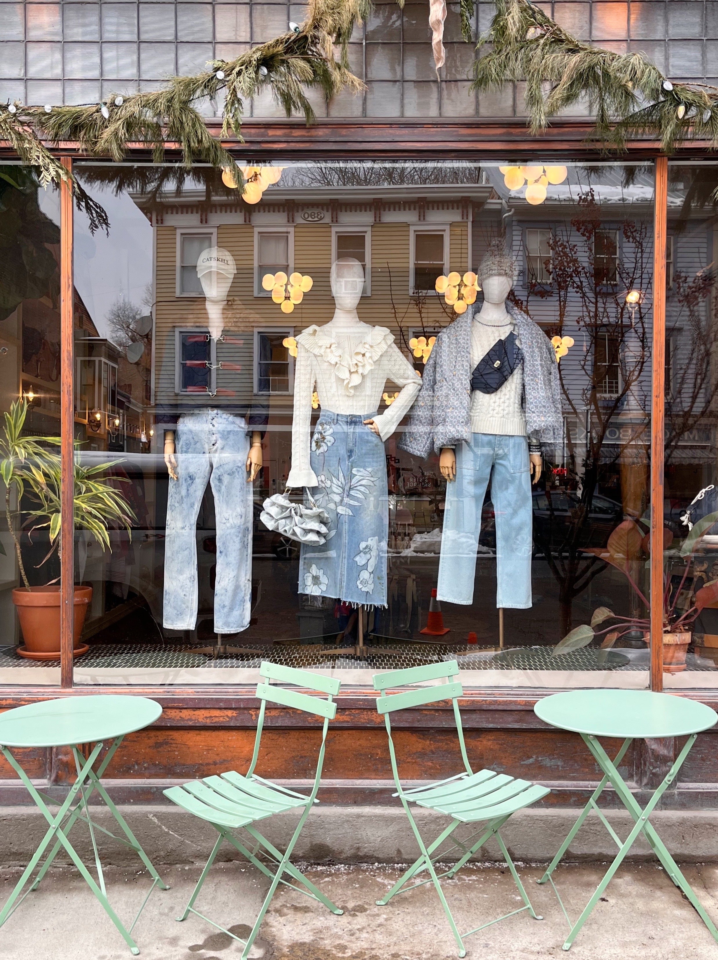 Our Catskill Shopgirls are embracing the winter blues, warming up faded denim with quilting, sweaters and even a spot of fur. The bottoms are hand-dyed vintage jeans from Krop Jeans, a hand-painted vintage skirt from Sherri Cohen, and straight-up vintage from Sergio Vintage. The tops are a navy Sloppy Seconds quilted liner with alpaca collar; a ruffled vintage sweater and Rag & Bone cable knit, both from Sergio; and a jacket sewn from a vintage quilt by The Highlands Foundry. The hats are our Catskill baseball cap and a Baltistny beanie; and the bags are both from our MXH Bags line!